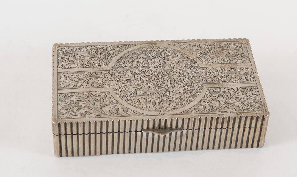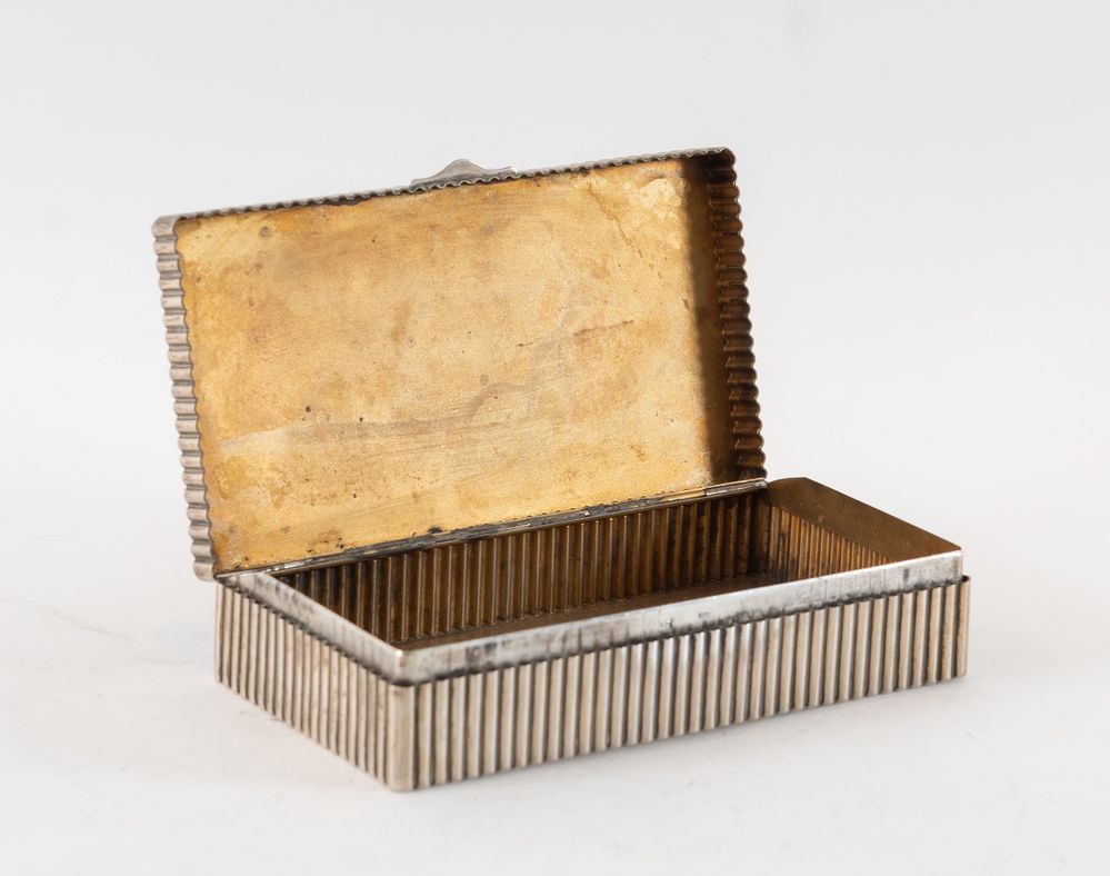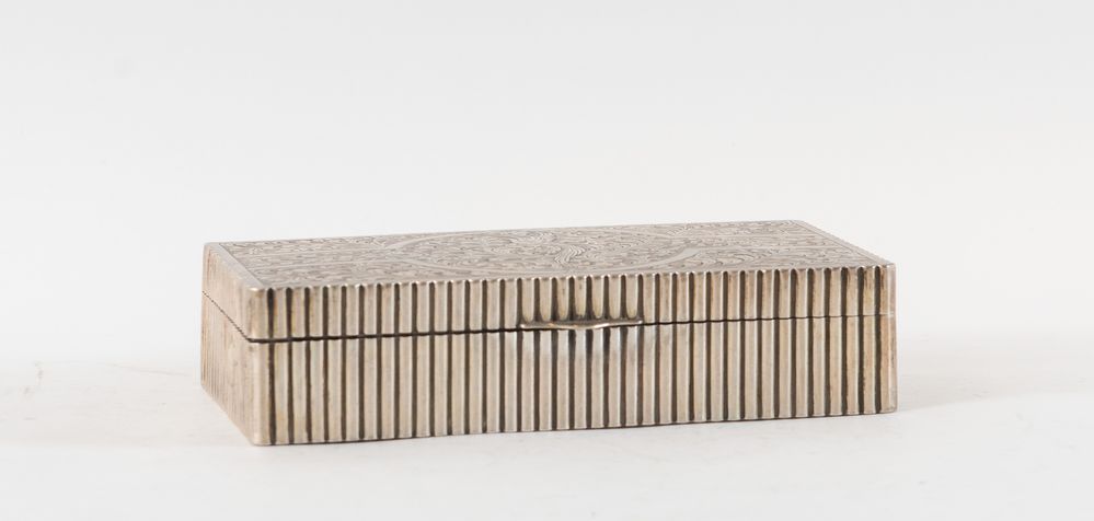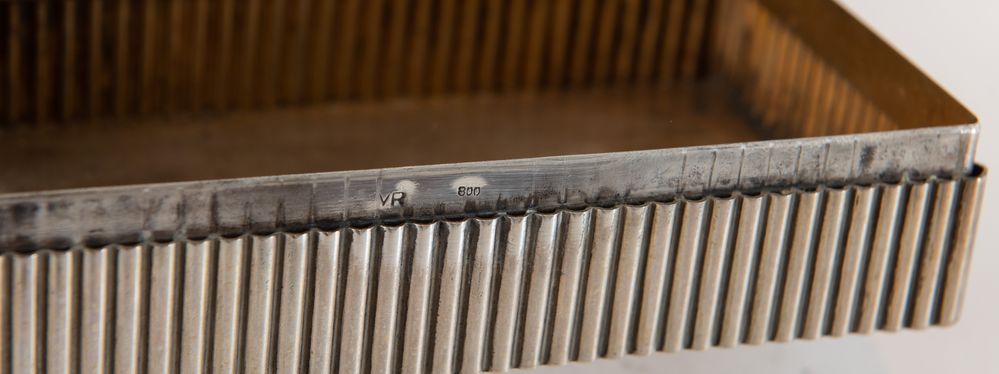 Scatola in argento 800 con interno in vermeille. Sul bordo interno reca punzoni: VR e 800. Cm 4x17x9. Peso: 407 gr.