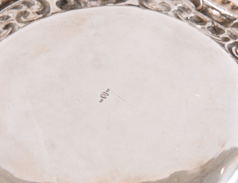 Piatto in argento 800. Al retro sulla base reca punzoni 800 e probabile stemma dell'argentiere. Diametro: cm 30. Peso: 497 gr.