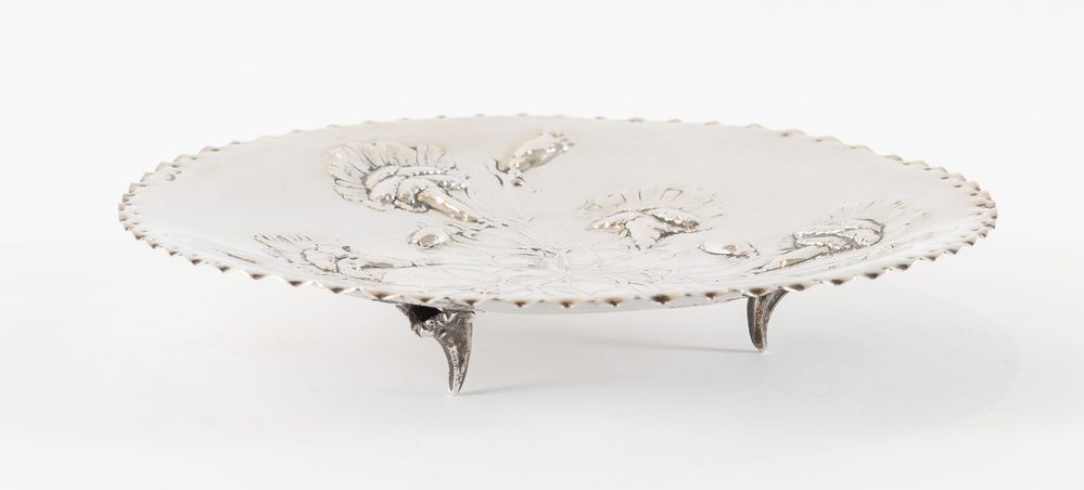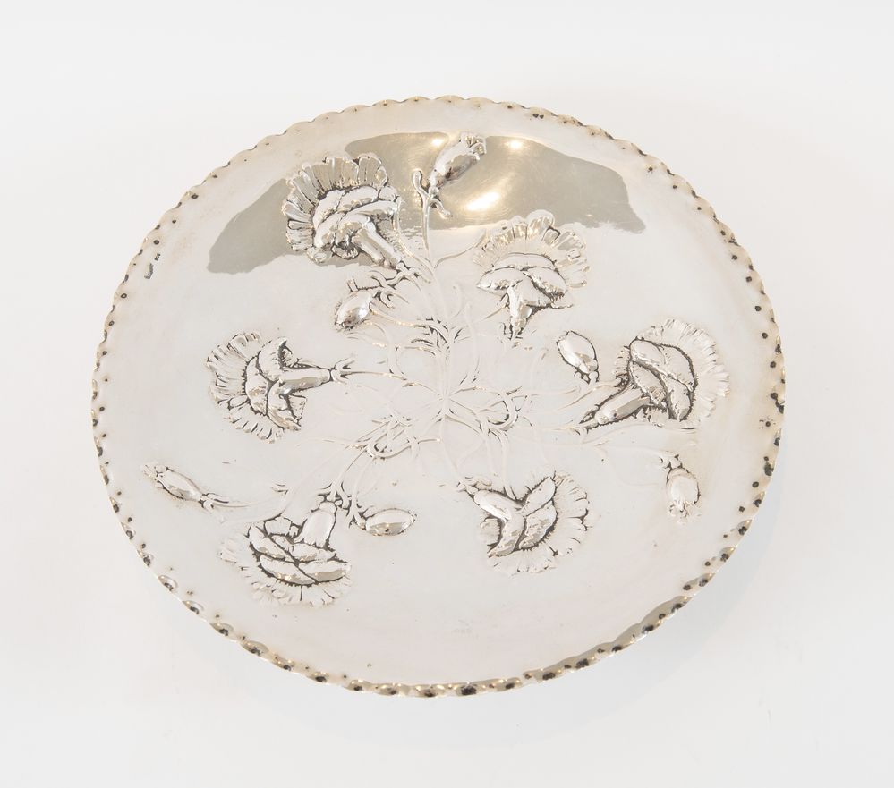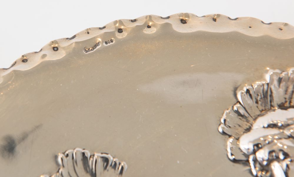 Alzatina con motivi floreali in argento 800. Sul bordo reca punzoni 800 e...
