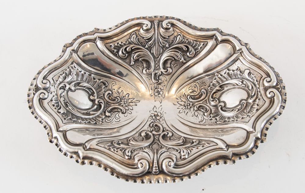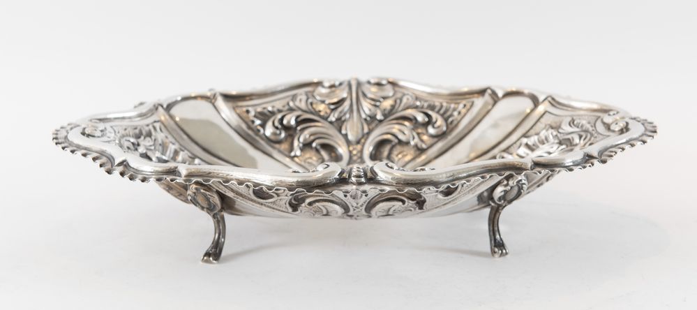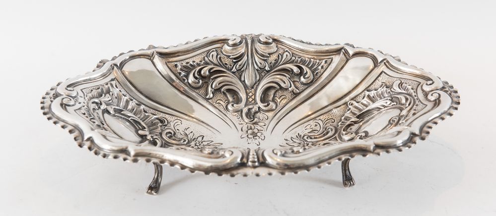 Centrotavola in argento. Sul bordo reca punzoni: 800 e stemma non identificato. Cm 36,5x26,5x7. Peso: 667 gr.