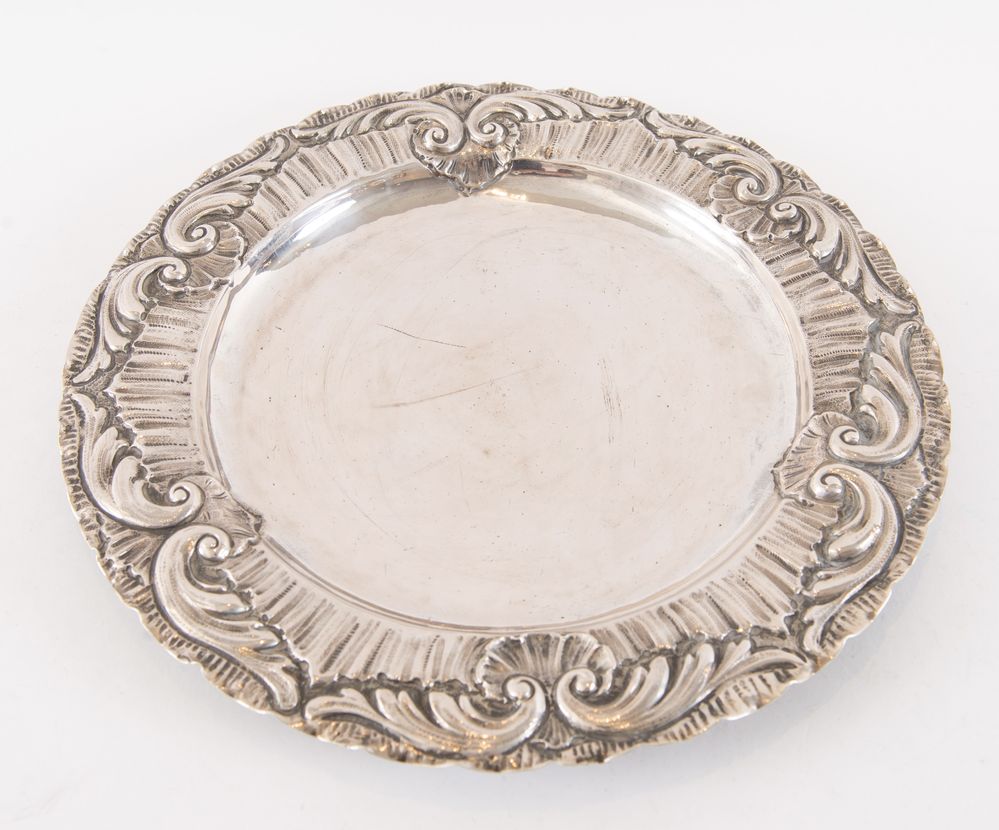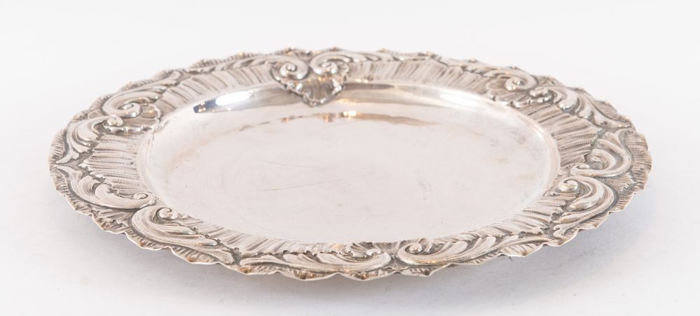 Piatto in argento. Non reca punzoni evidenti. Cm 2,5x31. Peso 607 gr.