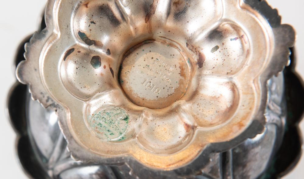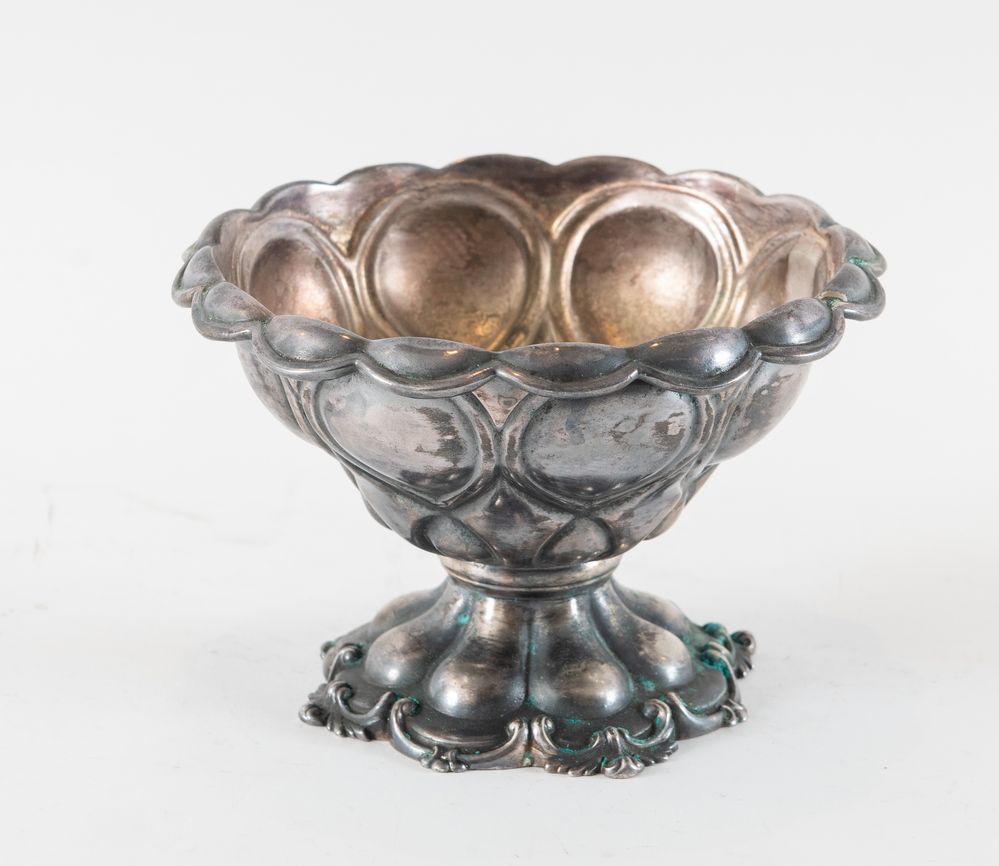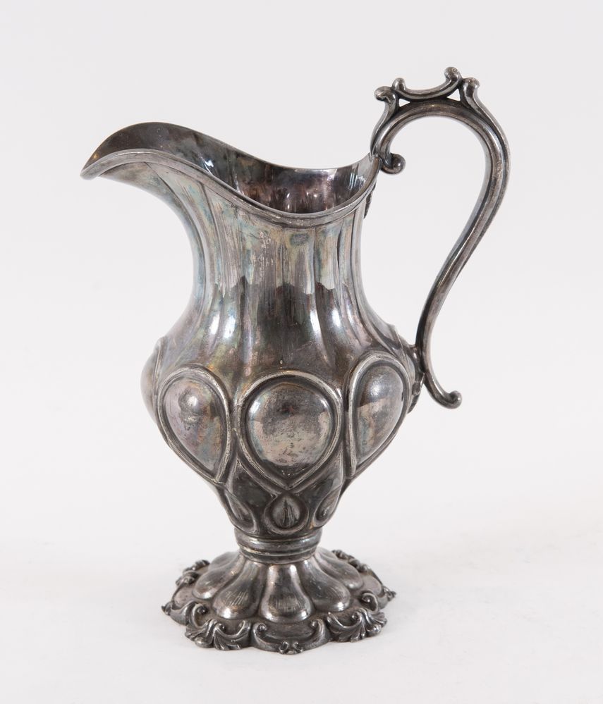 Rogers bros, Inghilterra. Inizio XX secolo. Lotto composto da versatoio e alzatina in metallo argentato. Recano punzoni sotto la base: Design patented Gian.12.1859, Rogers bros Mfg.co. Alzatina: Ø cm 16,5, altezza cm 11, peso 377 gr. Versatoio: altezza cm 19, lunghezza cm 14, larghezza cm 9,5, peso 338 gr.