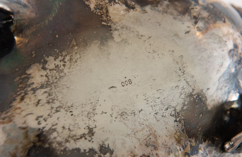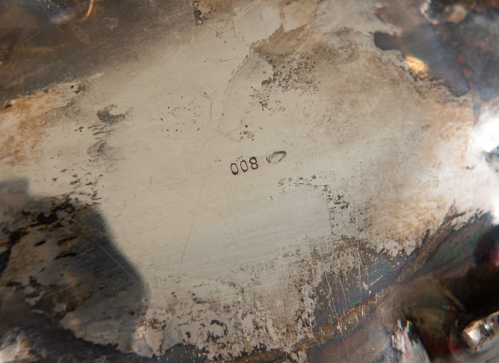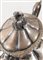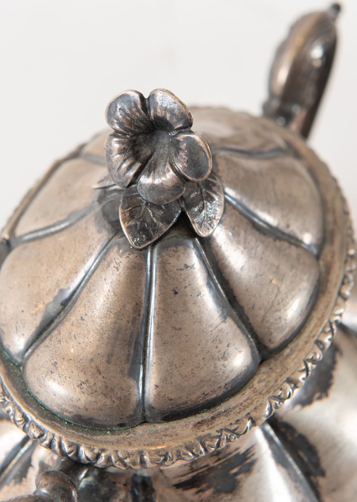 ITALIA, XX secolo. Set composto da teiera e zuccheriera. Sotto la base recano punzoni 800 e losanga locativa non identificata. Teiera: cm 22,5x32x13; zuccheriera: cm 15x20x11,5. Peso complessivo: 1720 gr.
