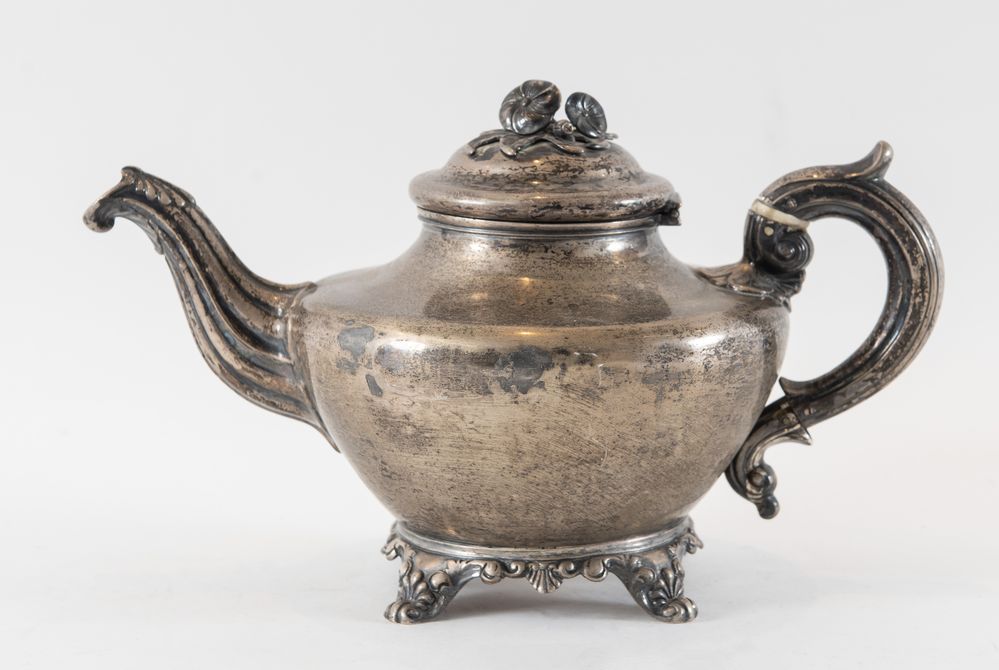 Hamilton & Co., Calcutta, metà del XIX secolo. Teiera in argento 925. Sotto la base reca punzoni: H&C, elefante, vaso, A. Cm 17,5x28x14. Peso: 792 gr.