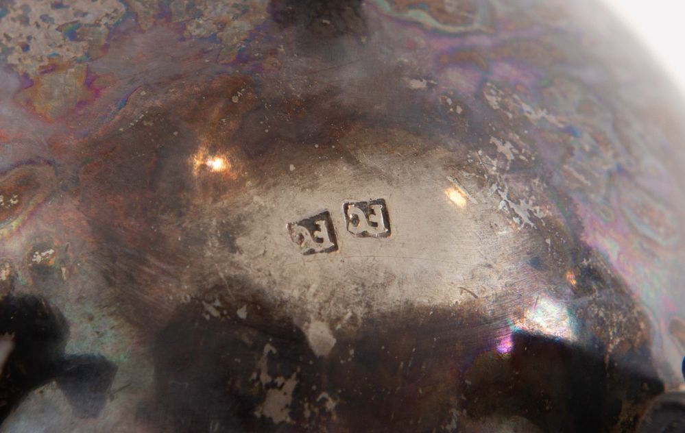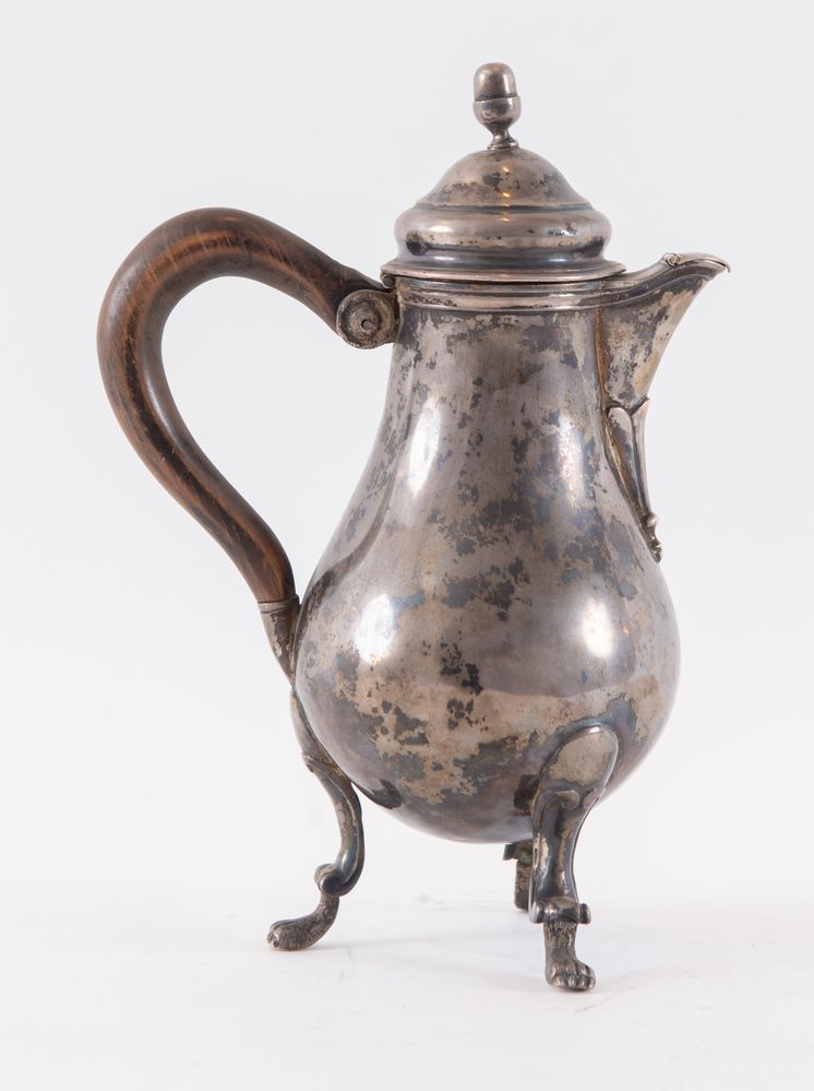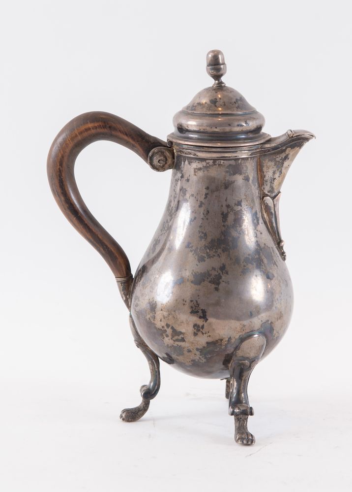 Fine del XVIII secolo. Caffettiera in argento. Sotto la base reca punzoni: FC, FC. Cm 22x15x10. Peso: 395 gr.