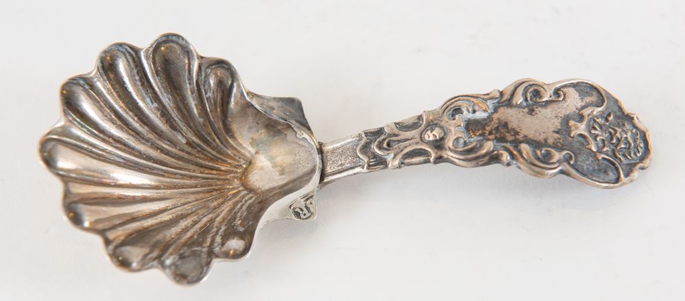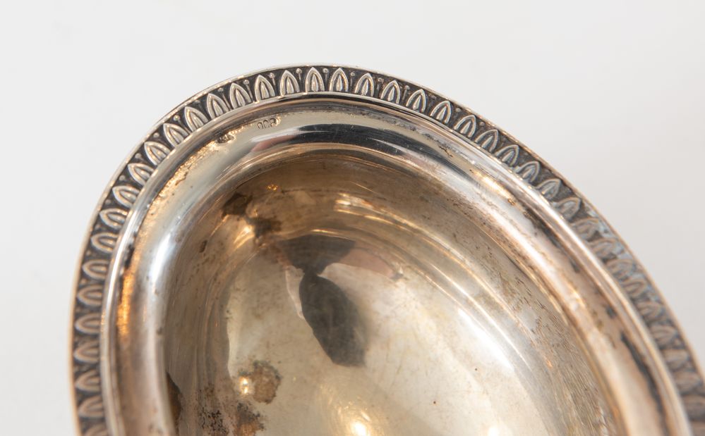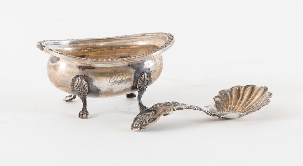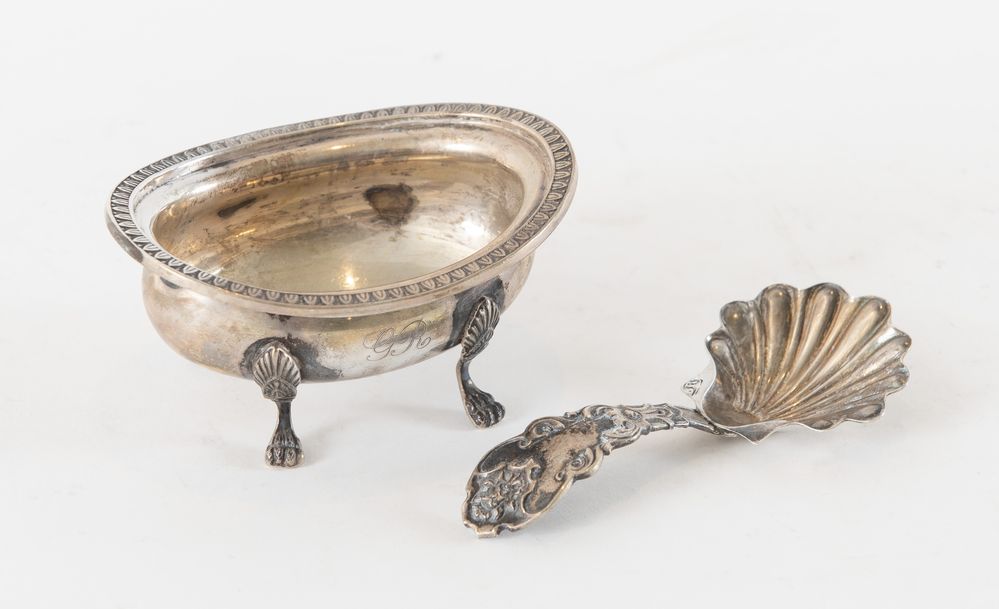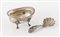 BRANDIMARTE, Firenze, XX secolo. Lotto composto da formaggiera e cucchiaio in argento 800. Il cucchiaio reca punzoni: BR, losanga locativa 283FI, 800. La formaggiera reca punzoni: 800 e losanga locativa non identificata. Formaggiera: cm 5x10x7,5; cucchiaio: cm 11x5. Peso complessivo: 99 gr.