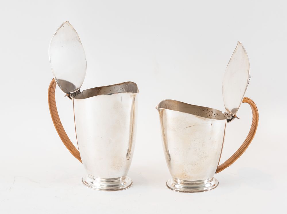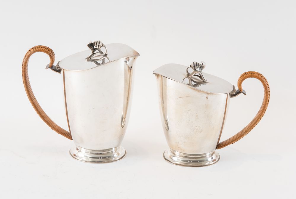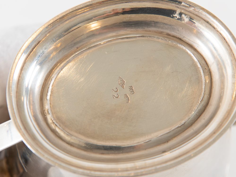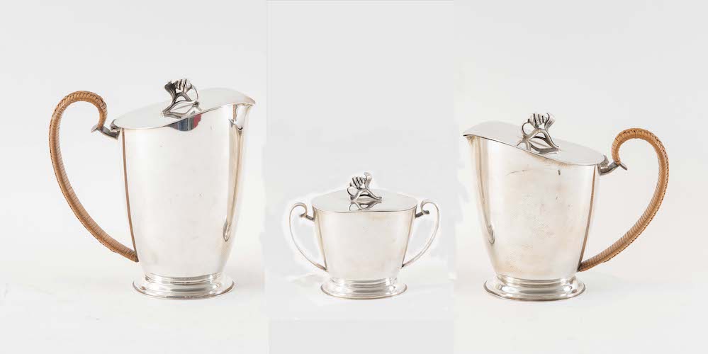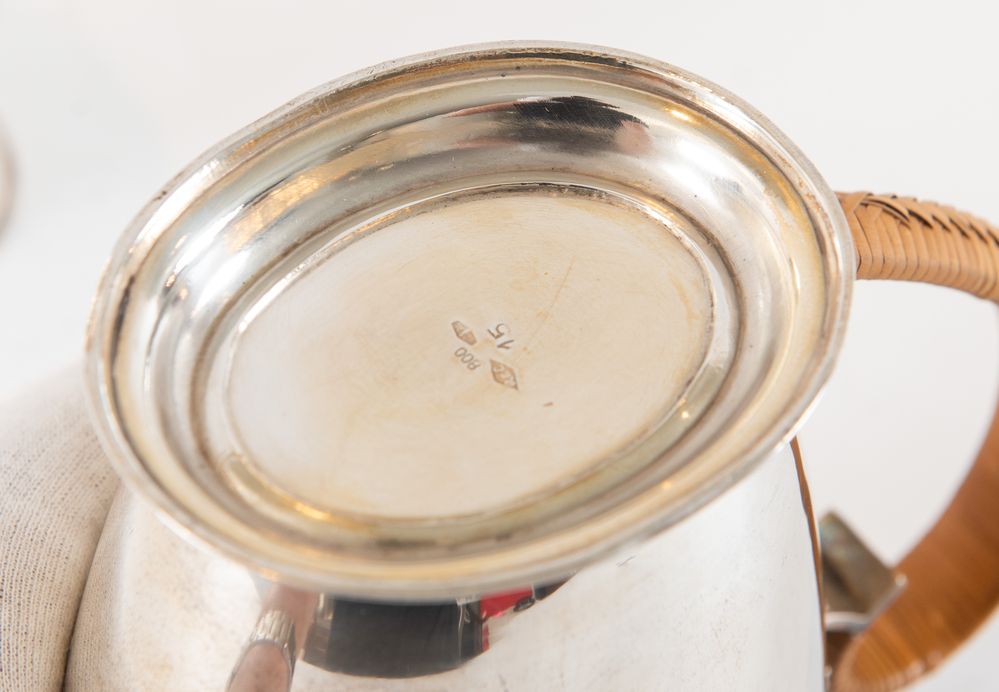 RICCI & C. S.p.A. , Alessandria, XX secolo. Servizio da tè in argento 800. Lotto composto da tre elementi: zuccheriera, teiera e caffettiera. Sotto la base recano punzoni: 800, losanga locativa 20AL, stemma dell'argentiere. Zuccheriera: cm 12x15x8. Teiera: 17,5x17x9. Caffettiera: cm 15x17x8,5. Peso complessivo: 1.095 gr.