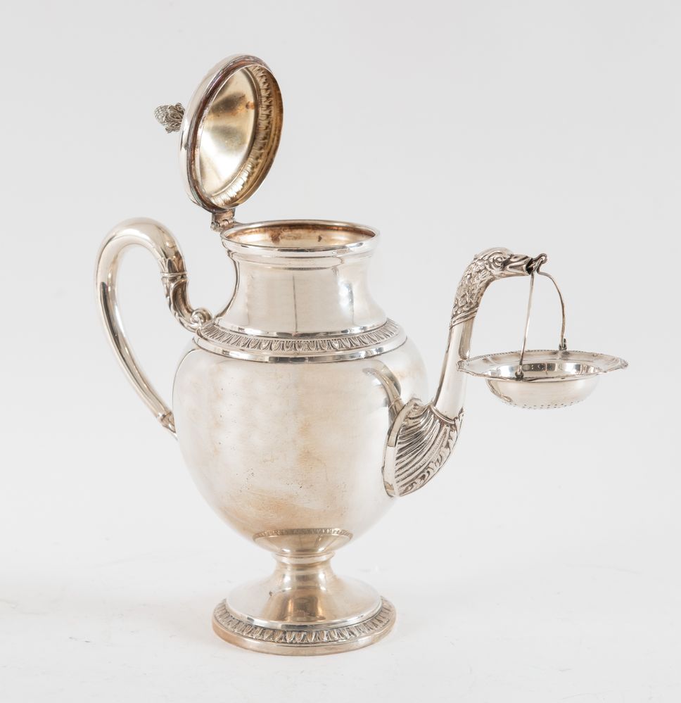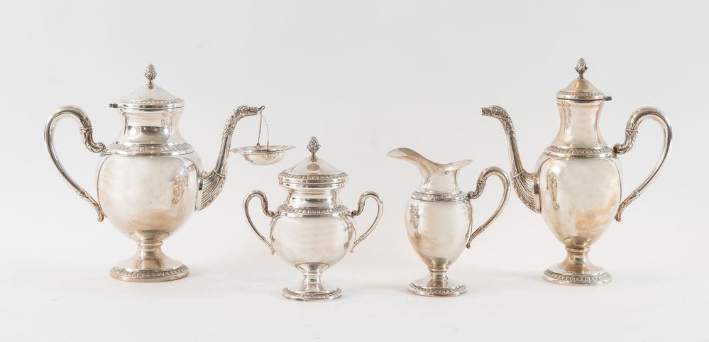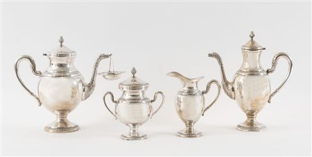 ARGENTERIA L.A.M. di SEGRE & C. S.n.c., Vercelli, XX secolo. Servizio da te composto da 4 pezzi: lattiera, zuccheriera, caffettiera e teiera. Sotto la base recano punzoni 800 e 40VC. Lattiera: cm 15x14x7. Zuccheriera: cm 18x14,5x10. Caffettiera: cm 26x21x9. Teiera: cm 25x28x11,5. Peso complessivo: 1.263 gr.