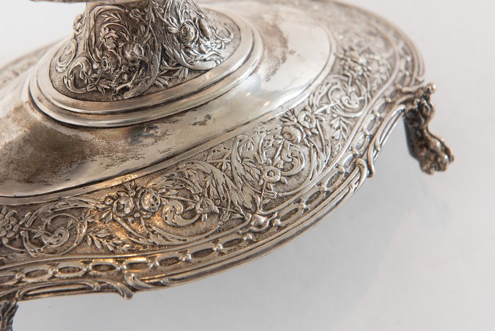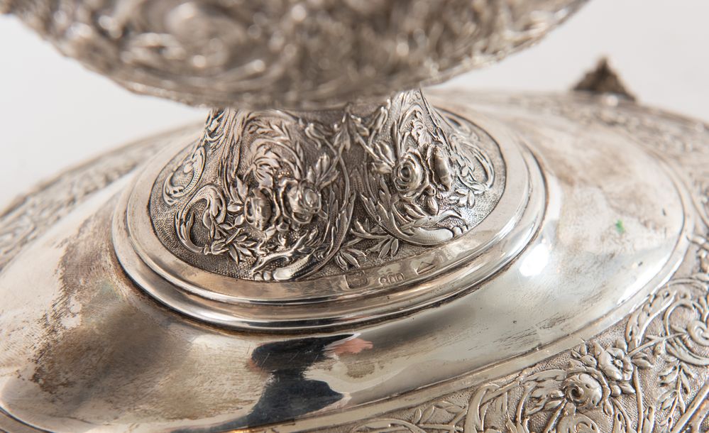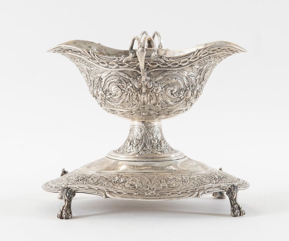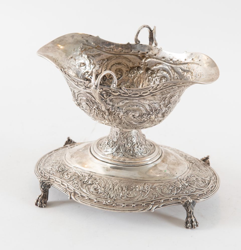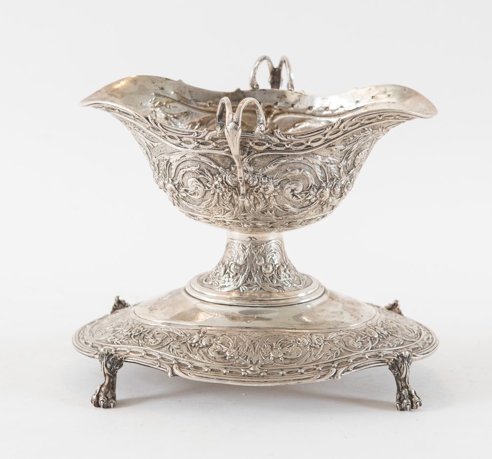 SALSIERA in argento 800. Sotto la base reca punzoni parzialmente leggibile: 800. Cm 17x19,3x13,6. Peso: 507 gr.