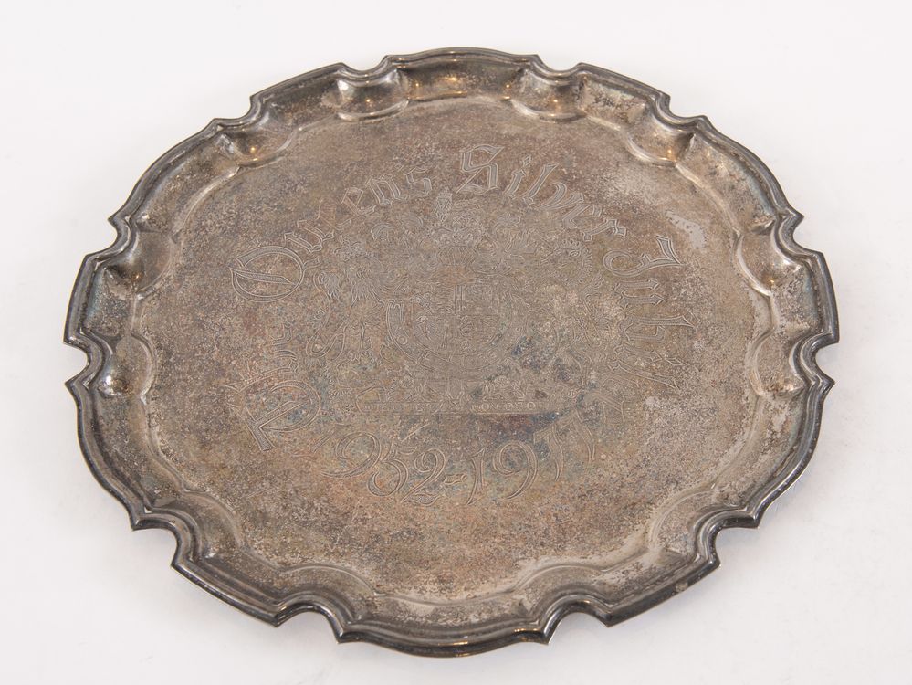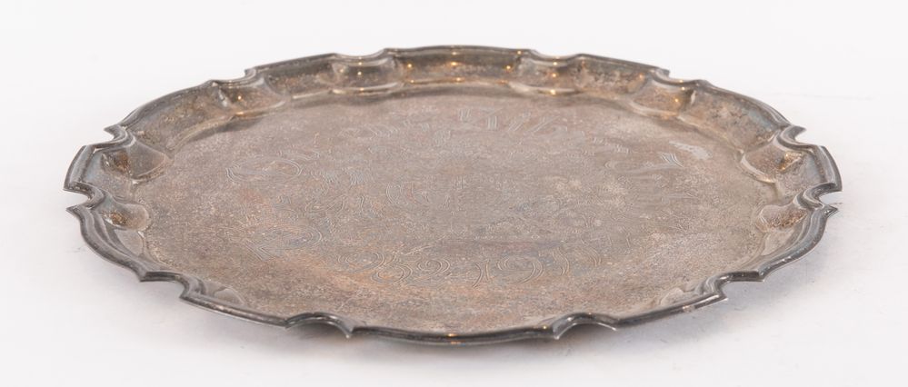 Inghilterra. Vassoio in silverplate. Sotto la base reca punzone Cavalier silver plated, England. Sopra reca lavorazione ad incisione. Ø: cm 31,5.