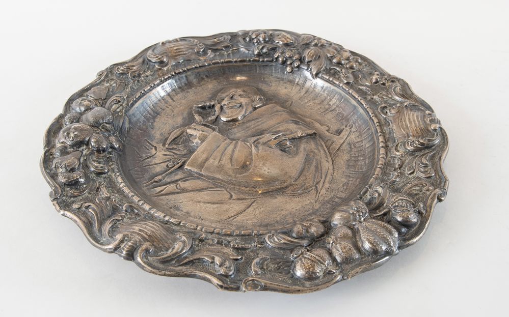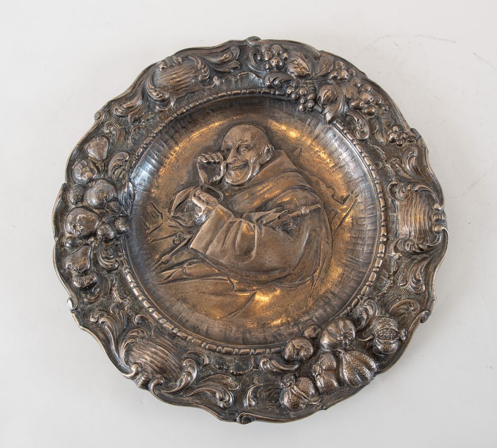 PIATTO in argento, sbalzato a mano. Non reca punzoni evidenti. Ø: cm 38,5. Peso: 821 gr.