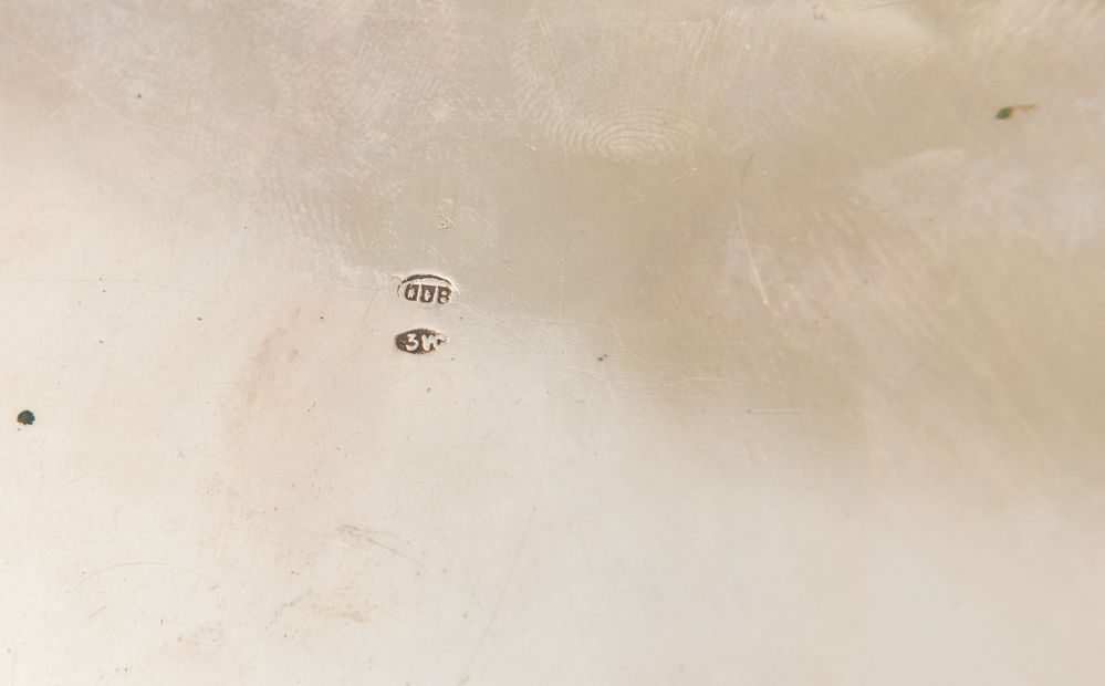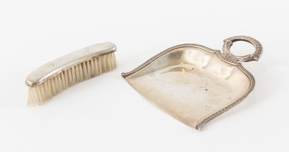 CASTAUDI & GAUTERO di EMANUELLI & PASTORE, Vercelli, XX secolo. Raccoglicenere in argento 800.. Sotto la base e sul bordo della spazzola recano punzone: 800 e losanga locativa 3VC. Paletta: 2x18,3x17. Spazzolina: cm 3,7x17,5x3. Peso complessivo: 210 gr.