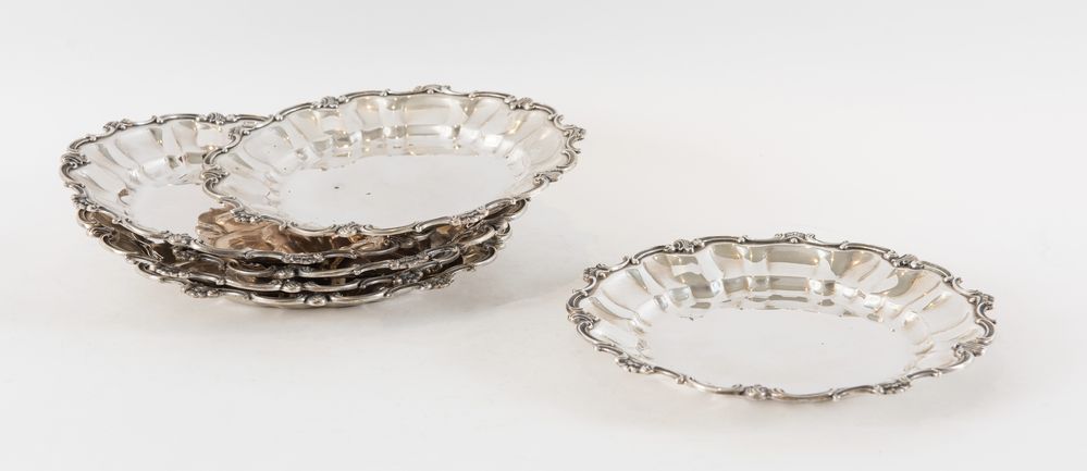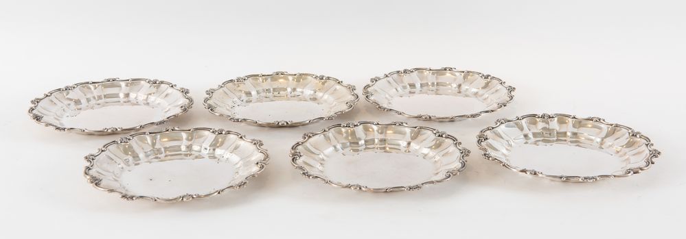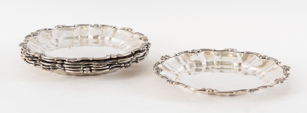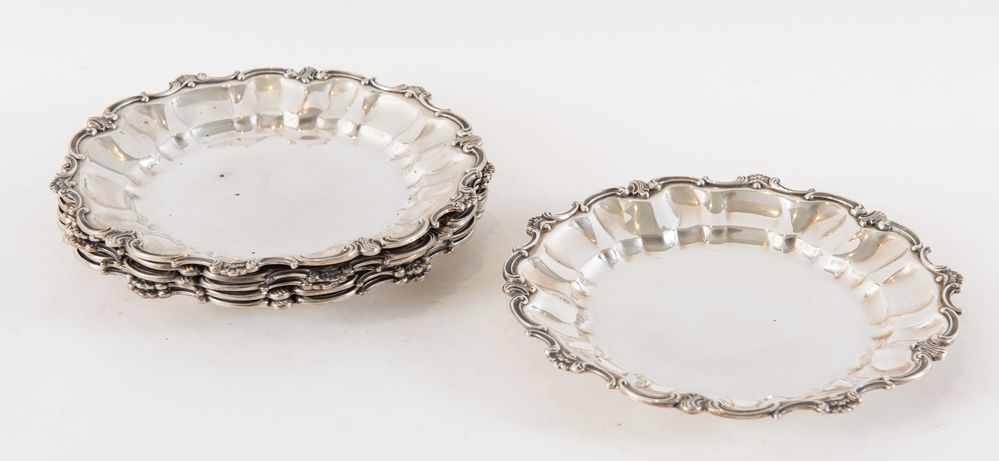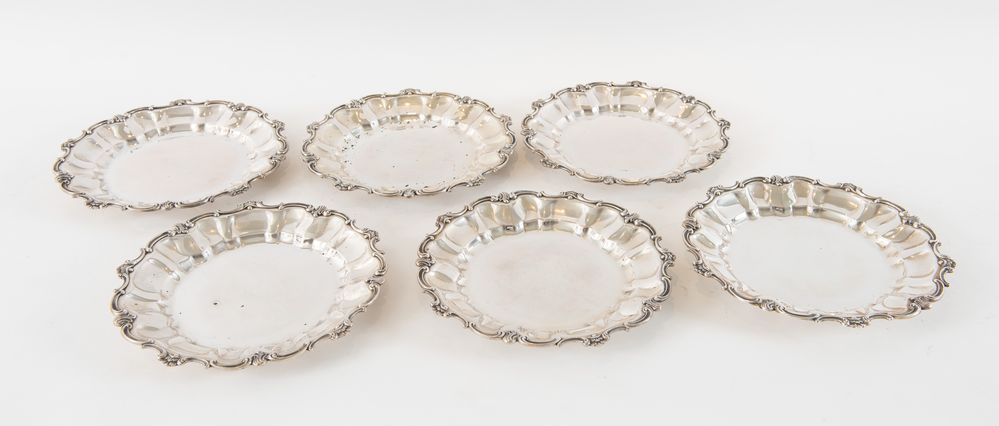Lotto composto da sei piattini in argento 800. Al retro recano punzoni 800 e animale rampante. Cadauno di diamentro cm 21,5. Peso complessivo: 1902 gr.