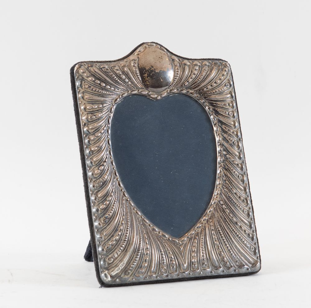 John Bull Ltd, Sheffield, 1988. Cornice in argento a cuore. Sul bordo inferiore reca punzoni: JBLD, simbolo di Sheffield, leone passante e lettera dataria O corsiva. Cm 19x14x11 (aperta).