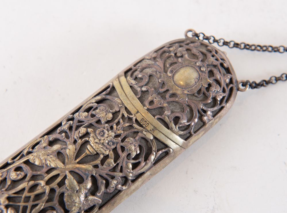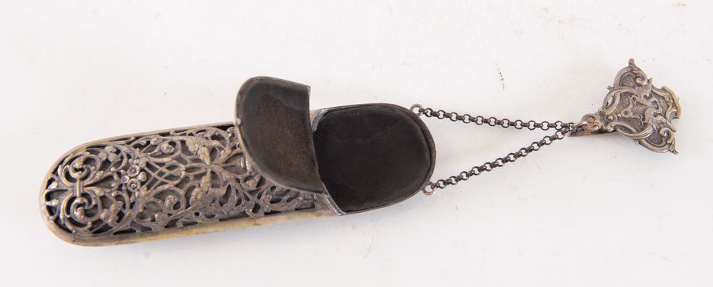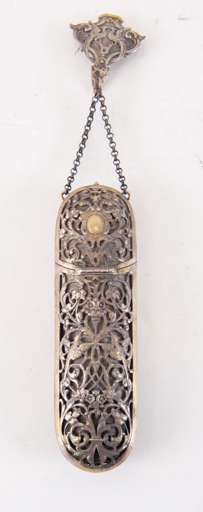 Irlanda (?), XIX secolo. Portaocchiali da signora. Recano punzoni: 800, leone passant e trifoglio incoronato. Cm 26,5x4,5. Peso complessivo: 121 gr.
