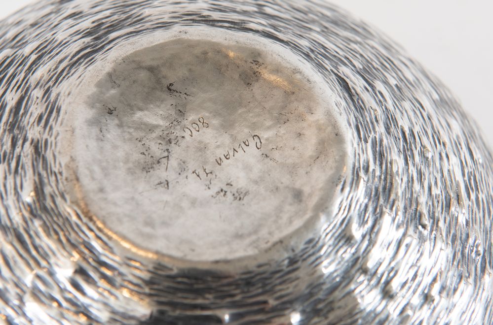 GALVAN, 1971. Ciotola in argento 800. Sotto la base reca punzoni Galvan '71, 800. Cm: Ø 20x7,5. Peso: 277 gr.