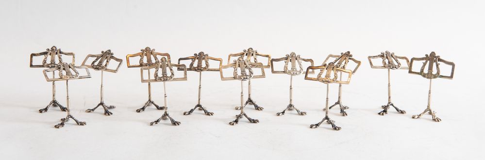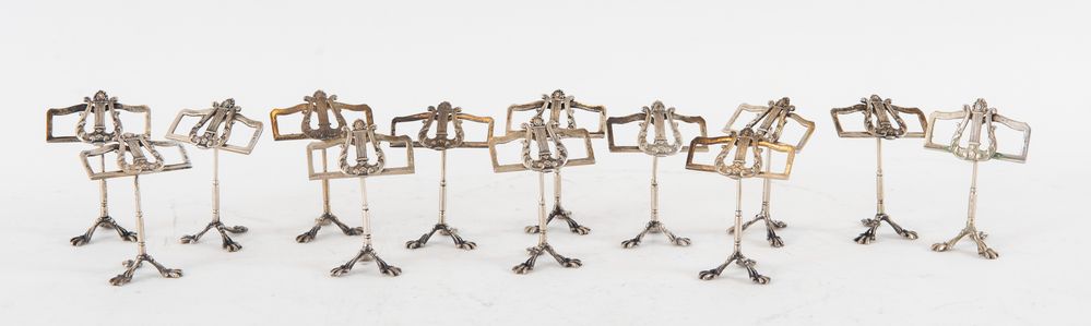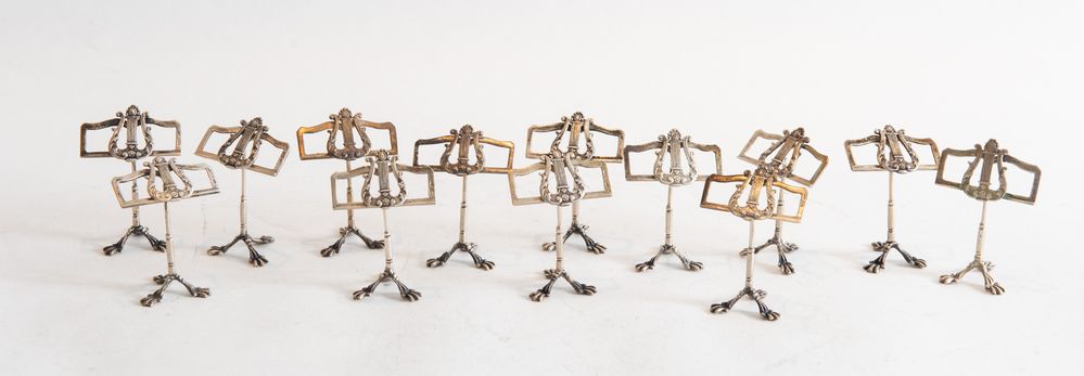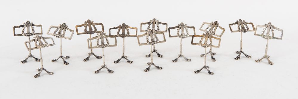 BELFIORE GIUSEPPE, Firenze, XX secolo. Lotto composto da tredici segnaposti in argento 800. Recano punzoni: 800 e losanga locativa 329FI. Cm 5,3x4,1x2,8. Peso complessivo: 150 gr.