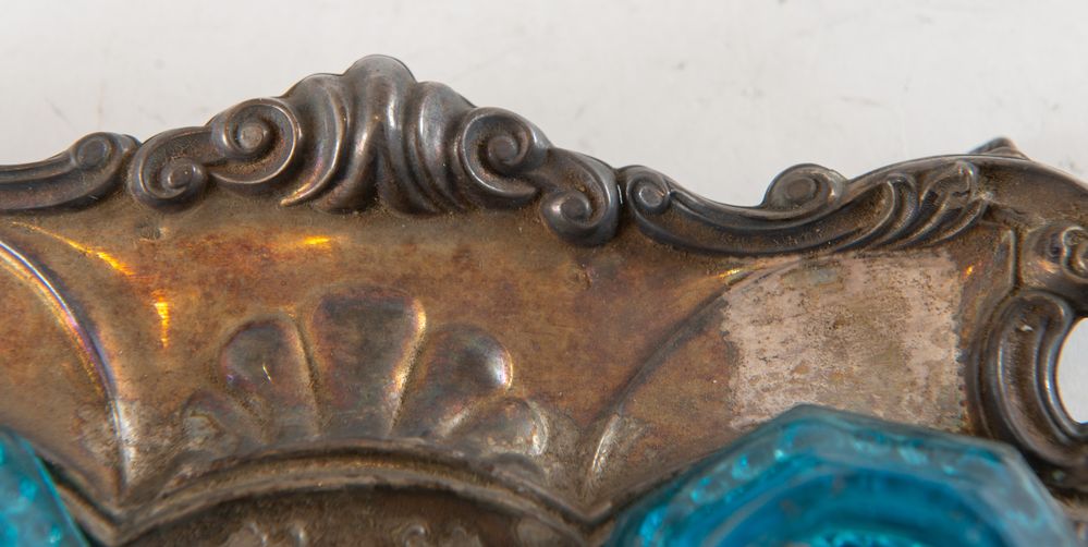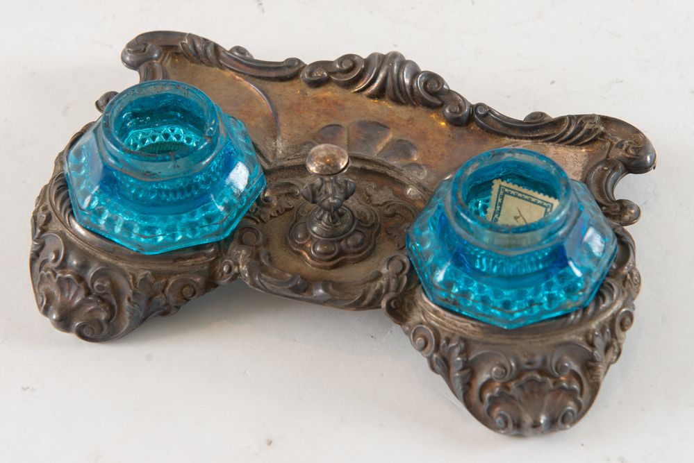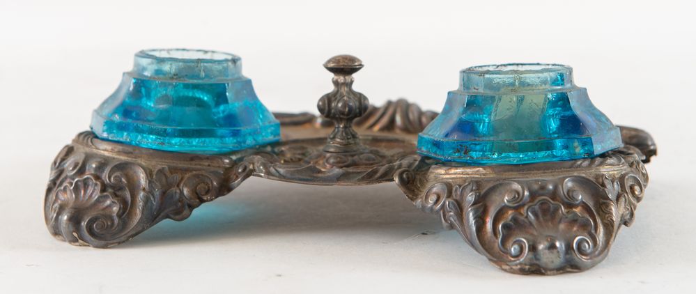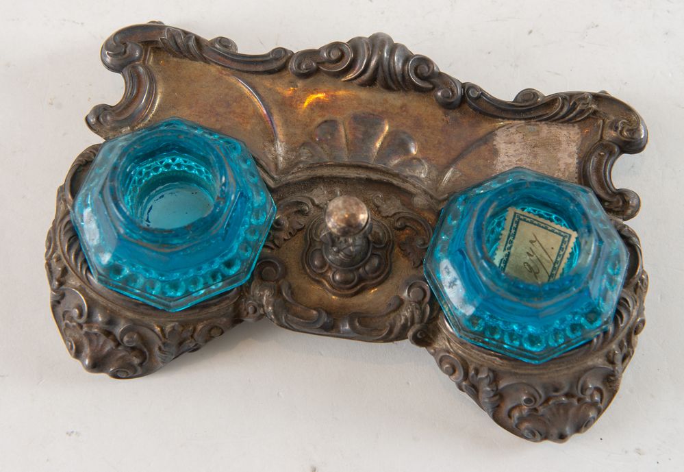 Italia, 1880 - 1890. Calamaio in argento con boccette in vetro colorato....