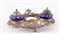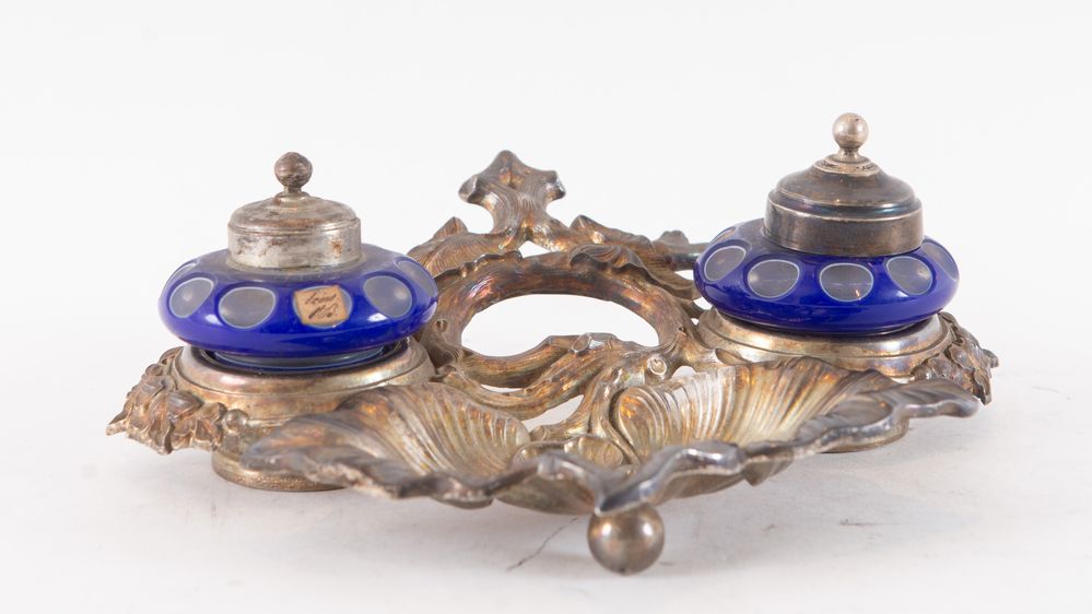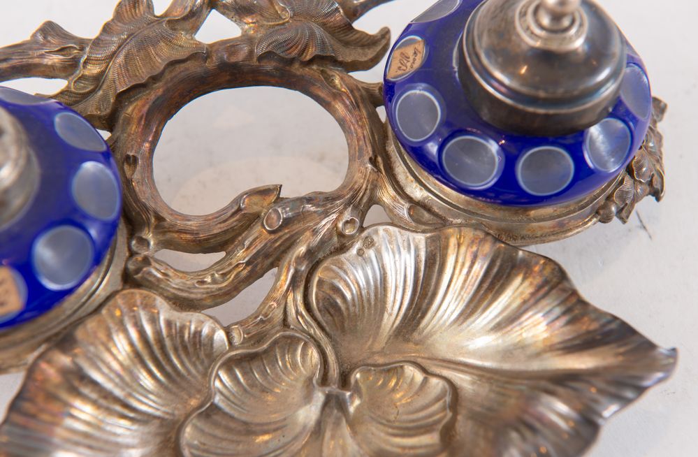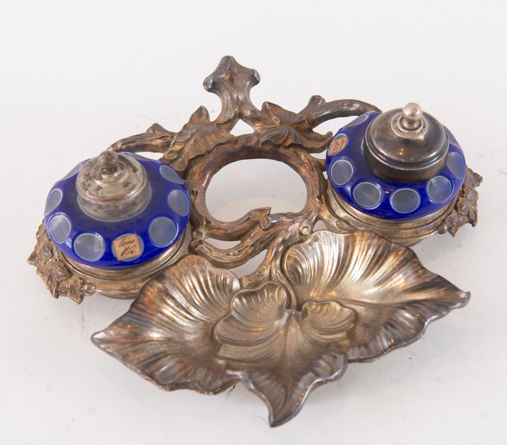 Calamaio in argento. Reca boccette in vetro colorato e tappi in argento. Sul piatto reca punzoni non decifrati. Cm 6x18x15,5. Peso dell'argento: 114 gr.