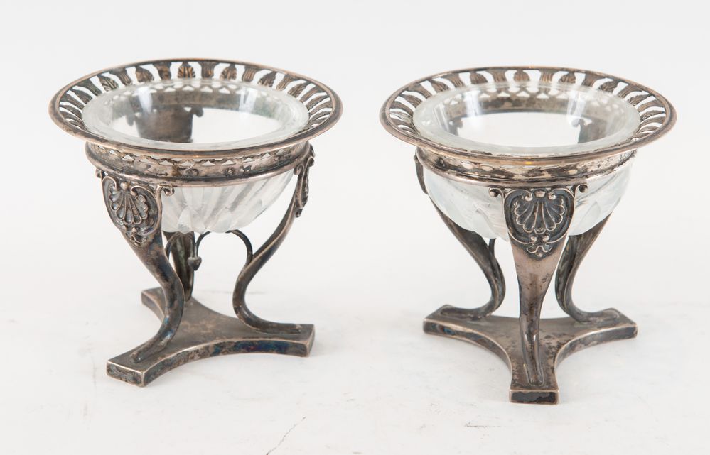 Milano, 1812-1872. Coppia di saliere tripodi in argento 800. Sul bordo recano...