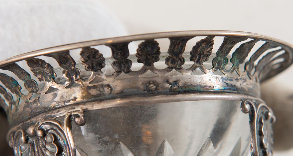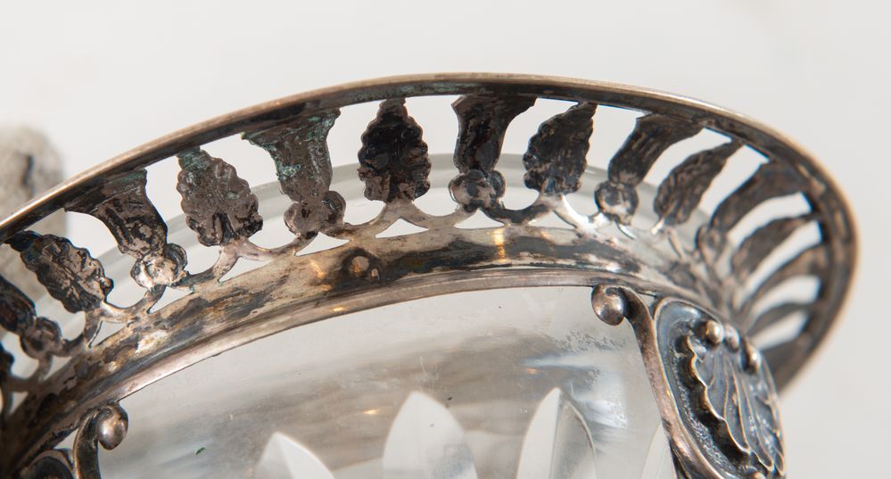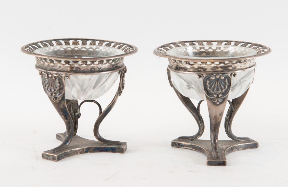 Milano, 1812-1872. Coppia di saliere tripodi in argento 800. Sul bordo recano punzoni del regno lombardo-veneto: titolo dell'argento 800 e simbolo della città di Milano. Cm 8,5xdiamentro 9,3. Peso dell'argento: 164 gr.