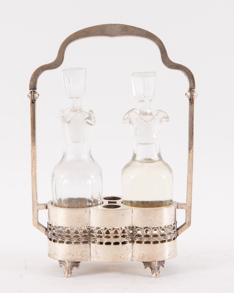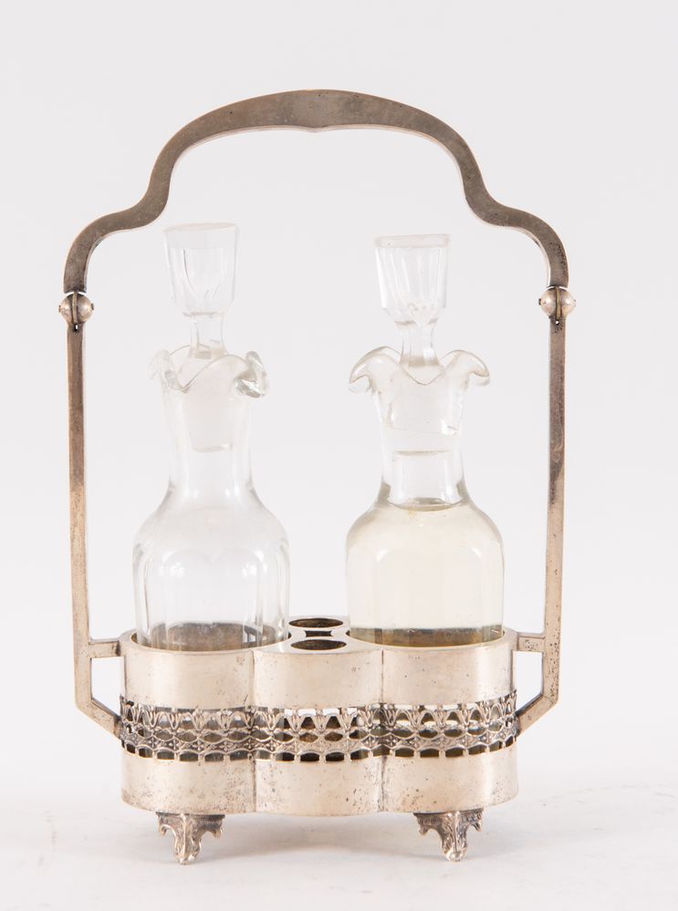 Portacondimenti in argento 800. Con boccette in vetro. Reca punzoni nel corpo...