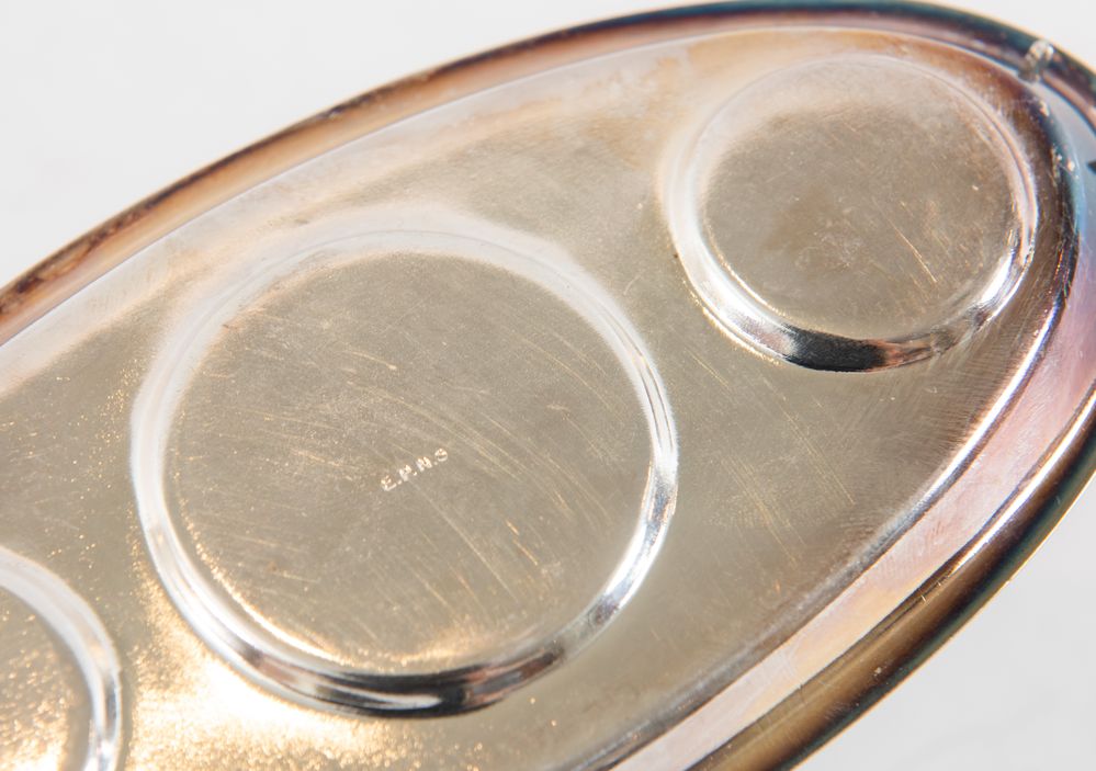 Portacondimenti in argento 800. Con boccette in vetro. Reca punzoni nel corpo centrale: 800 e uno illeggibile. Cm 21x13x5,5. Peso: 87 gr.