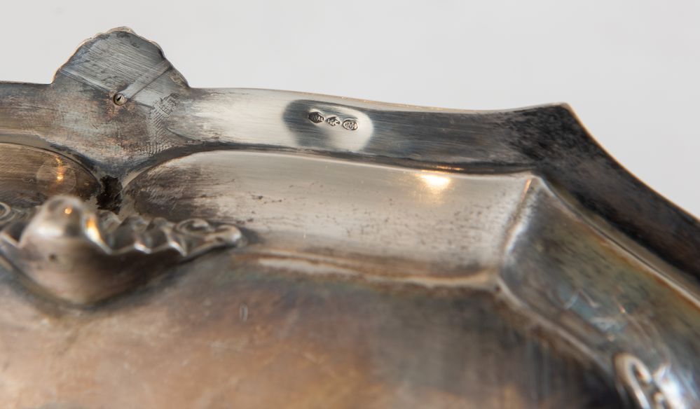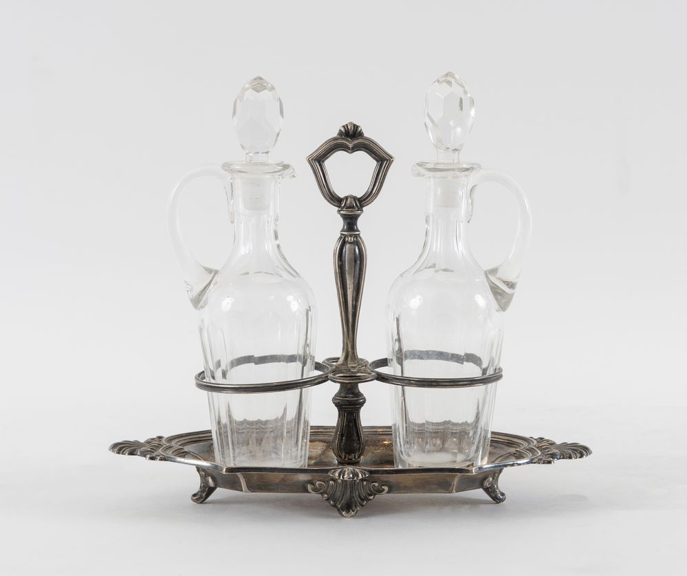 RICCI & C, Alessandria, XX secolo. Oliera in argento 800. Cm Sotto la base reca punzoni: losanga locativa 20AL, stemma dell'argentiere, 800. Cm 20x23,5x12. Peso: 279 gr.