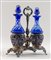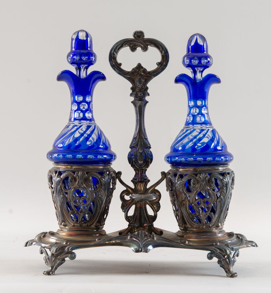 Fine del XIX secolo - inizio del XX secolo. Oliera in argento. Reca oliere in vetro blu. Sotto la base reca punzone non decifrato. Cm 27,5x27x12,8. Peso dell'argento: 454 gr.