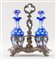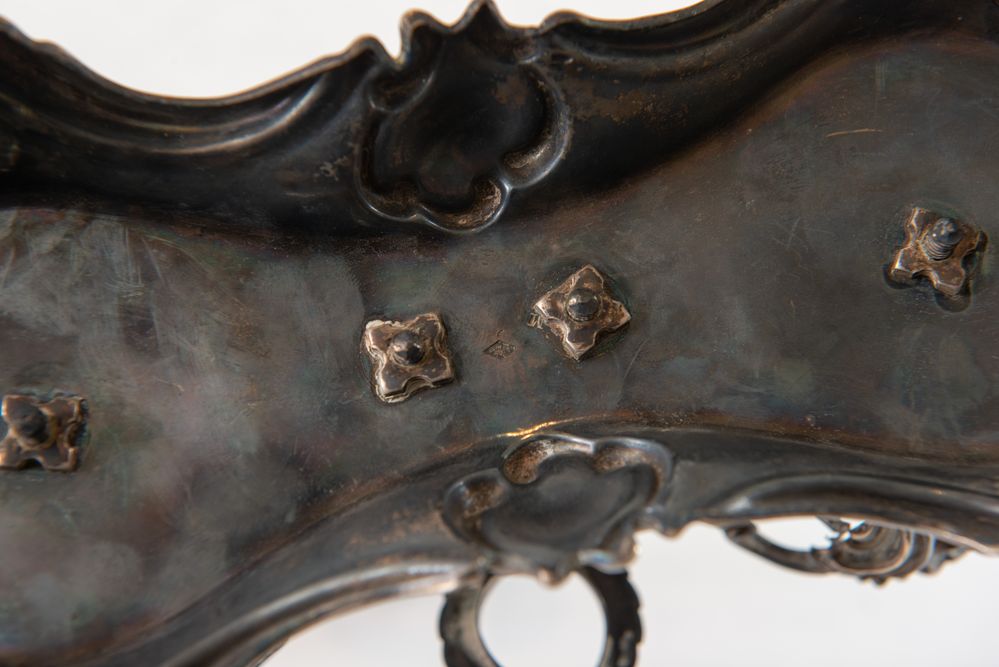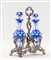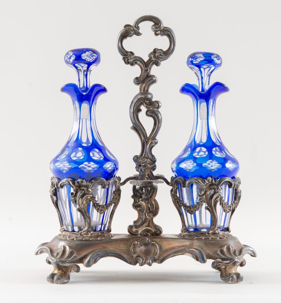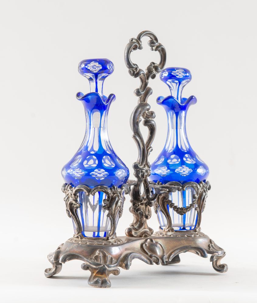 DEBAIN, Parigi (?), fine del XIX secolo. Oliera in argento. Reca oliere in vetro blu. Sotto la base reca punzone: stemma dell'argentiere Debain. Sul bordo inferiore laterale reca punzone non leggibile. Cm 29,5x24,3x10,5. Peso dell'argento: 403 gr.