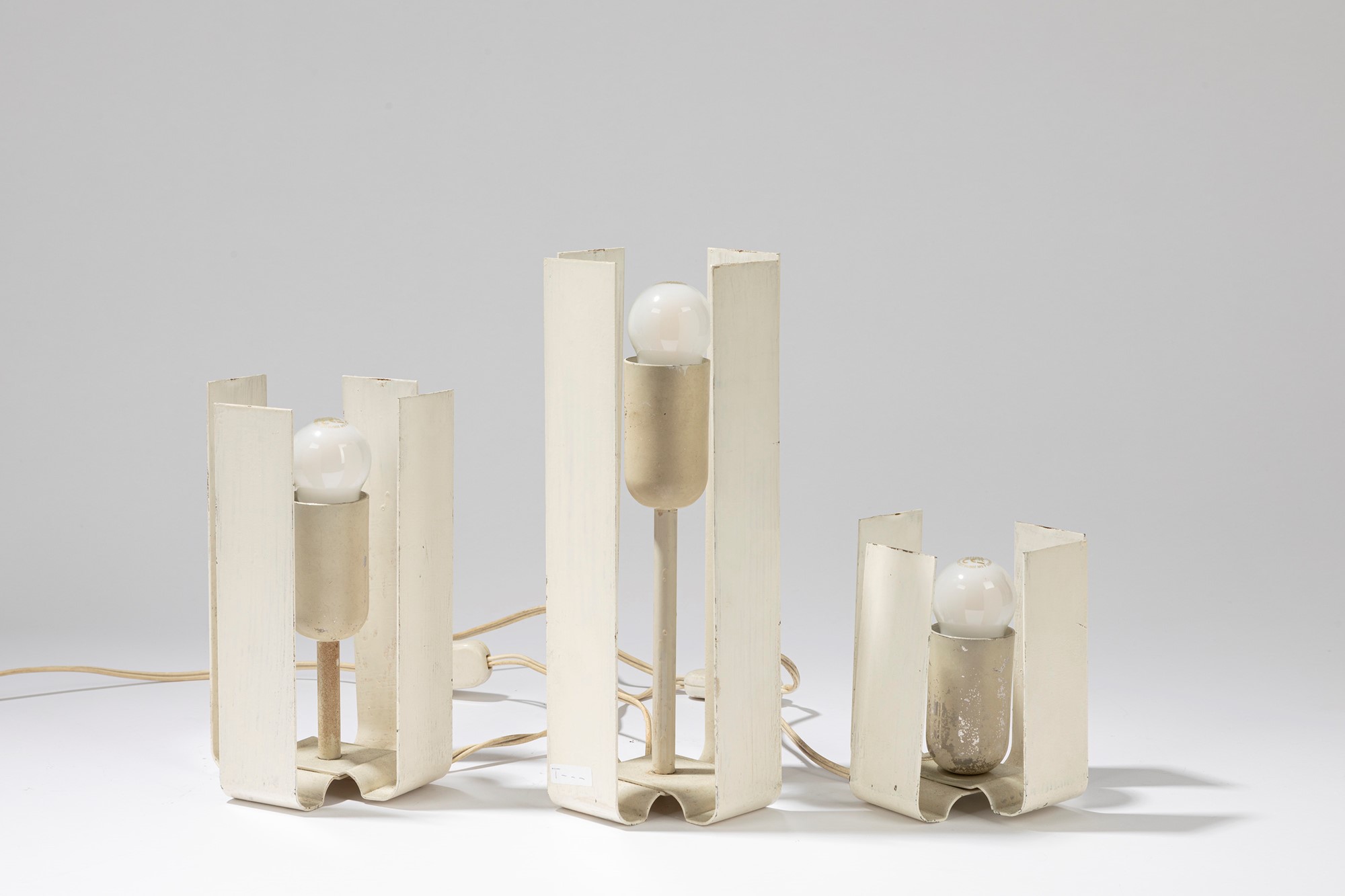 Manifattura Italiana - Tre lampade da tavolobase cm 13 x 13, H cm 15 /21, 28,5 in metallo smaltato bianco.