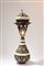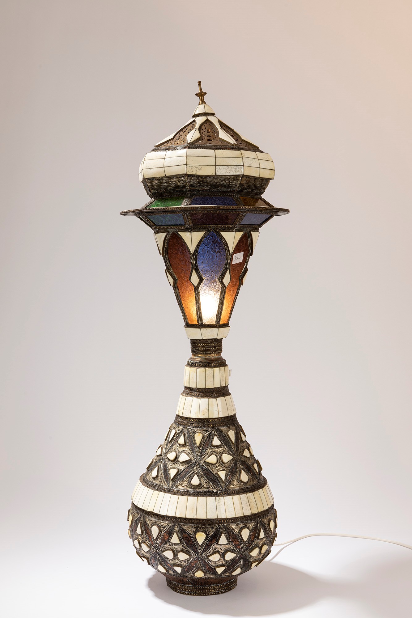 manifattura siriana - Lampada da tavolodm cm 35, H cm 100 in metallo con applicazioni in osso e vetri con decoro inciso.