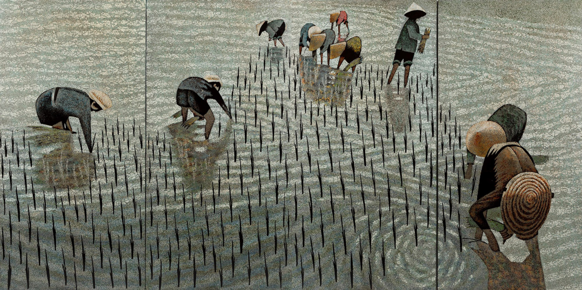 Vietnam - Quattro pannellicad cm 49 x 99 H x 2 p in lacca e guscio d'uovo.