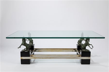 Valenti, Spagna (Attr.) - Coffee tablecm 120 x 70 x 37,5 Tavolino "cavalli". Legno dipinto di nero, tubolare di ottone, bronzo, vetro.