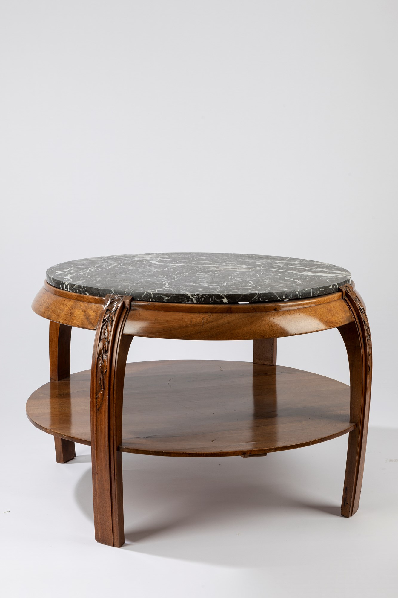 Manifattura Austriaca, XX secolo - Coffee tabledm cm 77 x 62 in legno intagliato, piano tondo in marmo.