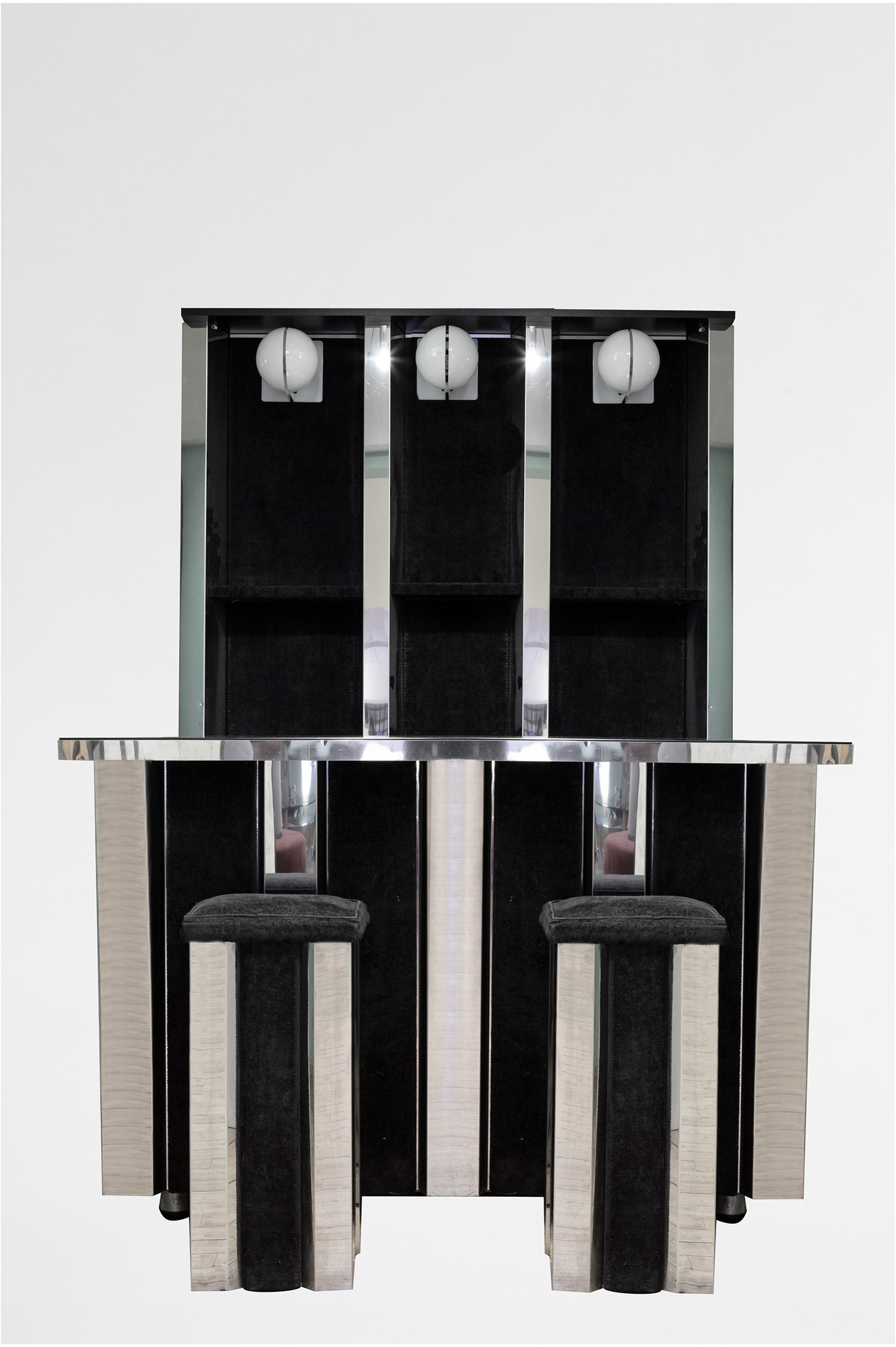 Manifattura Italiana - Mobile barbancone 149 cm x 64 cm x h. 98, misure bottigliera: 140,5 cm x 14,5 cm x h. 198 cm con bottigliera in acciaio e tessuto nero. Munito di frigorifero e due sgabelli abbinati.