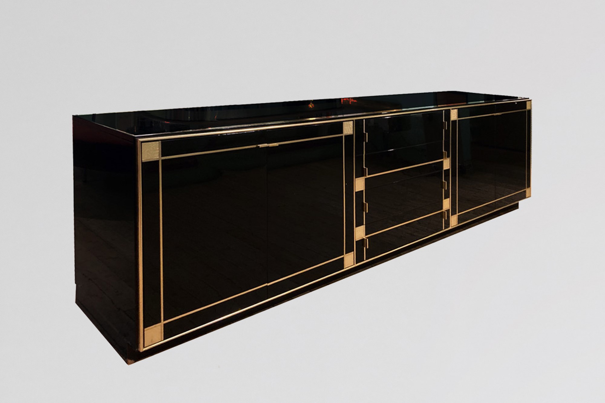 Pierre Cardin - Credenzacm 247 x 56 x 71,5 a quattro ante e quattro cassetti in legno laccato nero con profili e maniglie in ottone.
