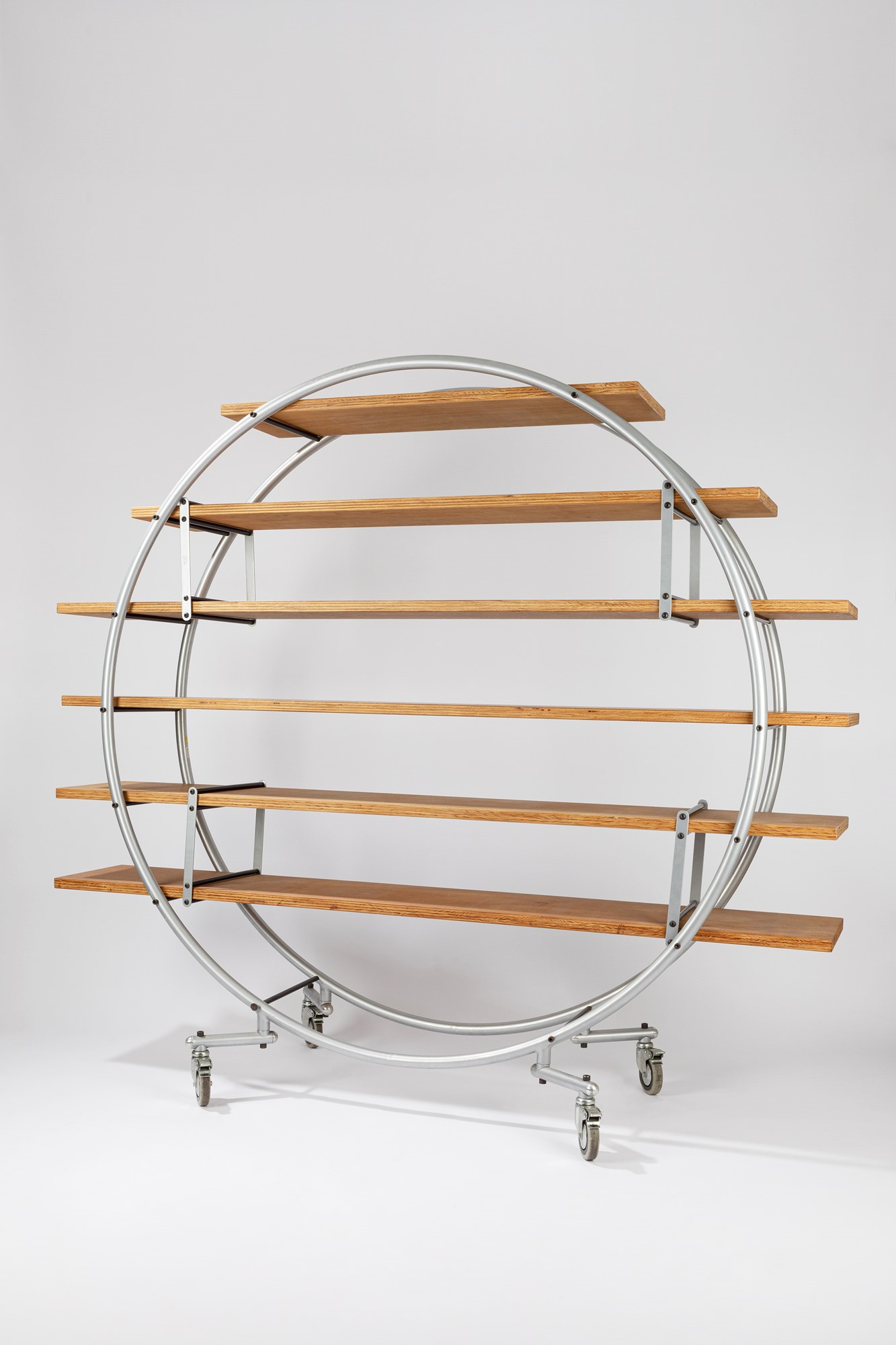 B.R.A.N.D. - Libreriacm 190 x 170 x 30 "Saturn"- scaffalatura aruota dal progetto "Cosmo, Gruppe B. R. A. N. D * (Rudolf Weber & Boris Broschardt) 1985/89, tubolare d’acciaio, spolverizzato, multistrato di faggio, naturale, su ruote.