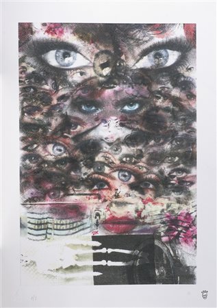 DODO Look the Death. Pigmenti su cartoncino. Cm 50,00 x 70,00. Ed.1/3 in basso a matita. Timbro DODO in basso a destra.Timbro a secco dell'Archivio Nordest, Seregno in basso a sinistra. Opera archiviata presso l'Archivio Nordest, Seregno come da documentazione fotografica allegata riportante il relativo numero d'archivio. Al retro numero d'archivio.
