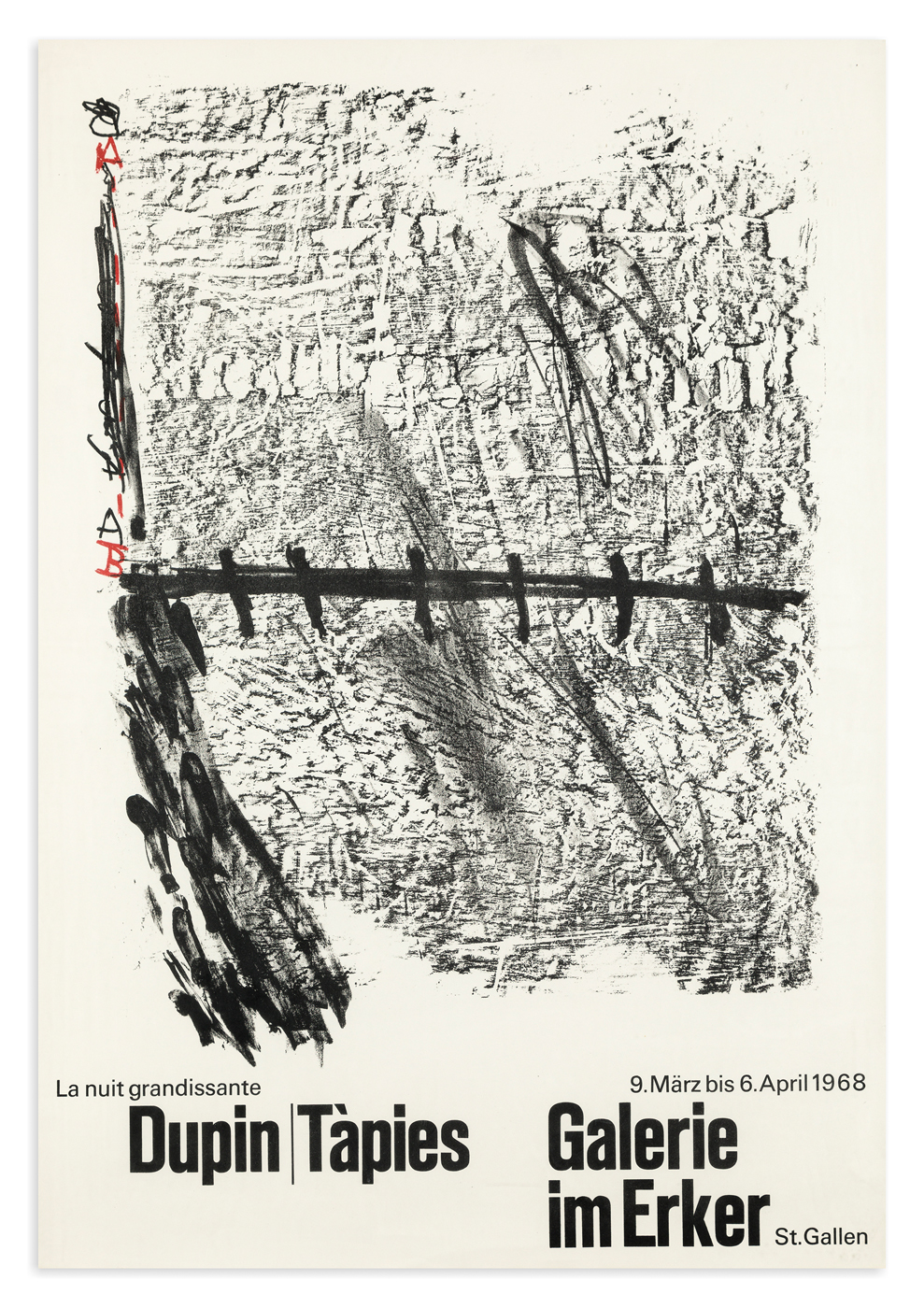 Locandina dell'esposizione 'La nuit grandissante. Dupin / Tàpies' tenutasi presso Galerie Im Erker St. Gallen, 1968