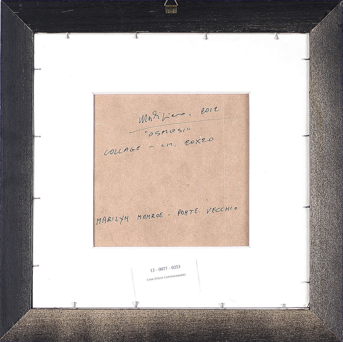 MALIPIERO (n. 1934) Osmosi. Marilyn Monroe - Ponte Vecchio. Tecnica mista e collage su tavola. Cm 20,00 x 20,00. Al retro titolo anno e firma. Autentica dell'artista su fotografia. Cornice presente