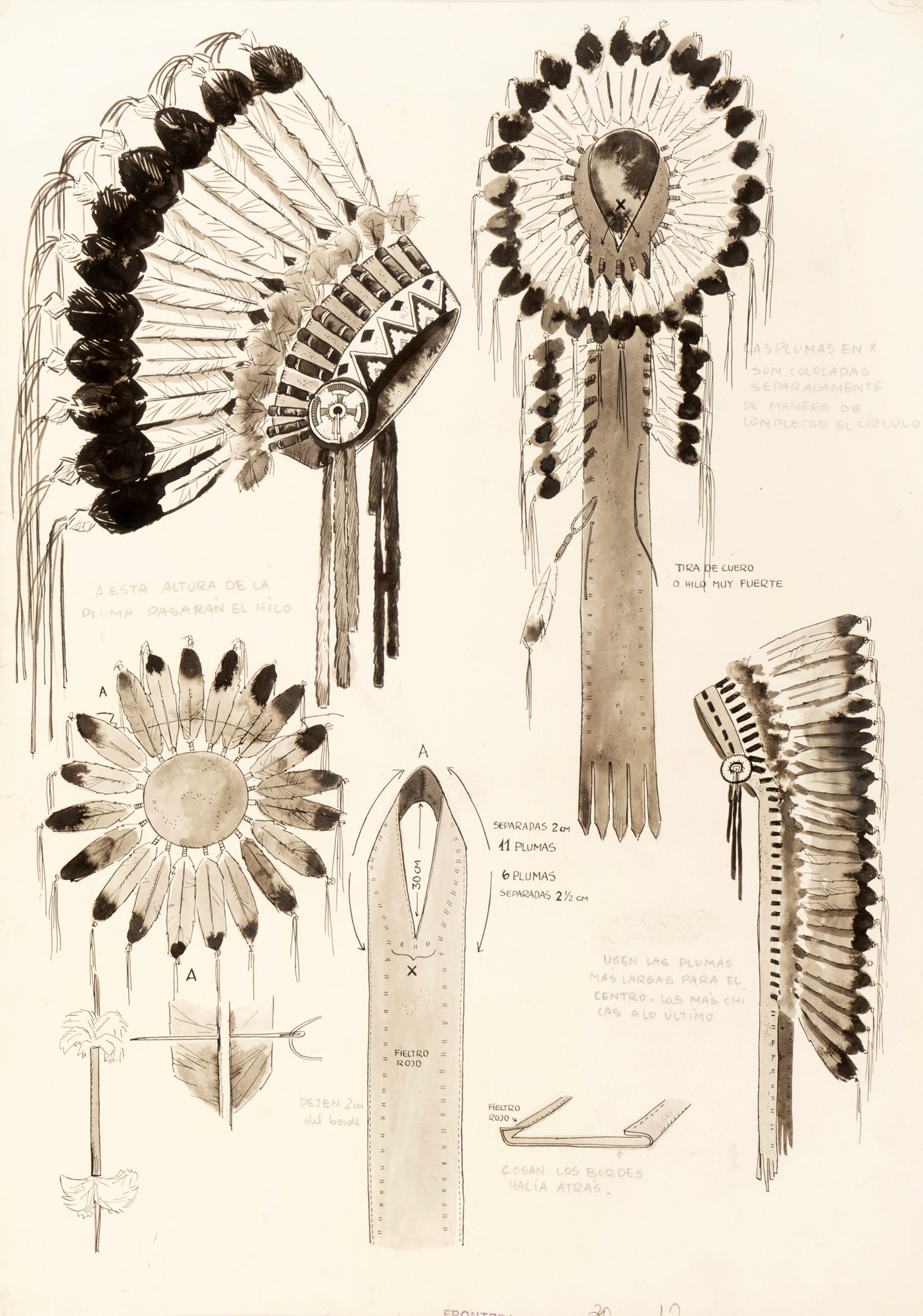 Tavola originale realizzata da Gisela Dester, collaboratrice e compagna di Pratt durante la sua permanenza in Argentina, per "El mundo de Ticonderoga", pubblicata per la prima volta sulla rivista Frontera Extra n. 30 dall’Editorial Frontera nel 1960. Questa serie di tavole, che fungevano da appendice storica alle storie di Ticonderoga Flint, furono pubblicate in Italia (attribuendo i disegni a Hugo Pratt) nel volume "Ticonderoga" dalle edizioni Il gatto e la volpe nel 1981. Lieve piega orizzontale al centro e piccoli strappi ai margini.