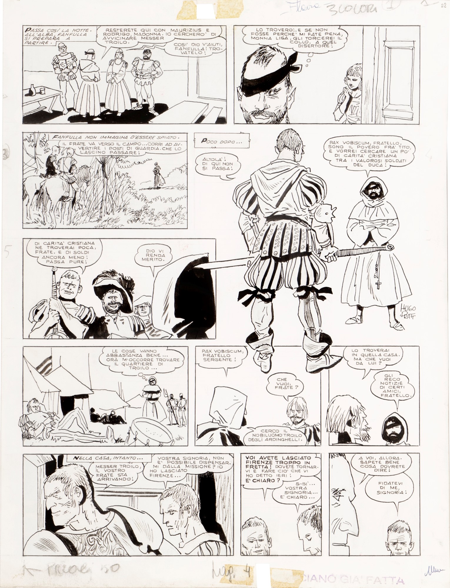 Tavola originale realizzata da Pratt per “Le avventure di Fanfulla”, pag. 22 di questa avventura che narra le gesta del soldato di ventura Fanfulla da Lodi, pubblicata per la prima volta a episodi sulle pagine del Corriere dei Piccoli tra il 1967 e il 1968. Firmata. Timbro editoriale al retro. Retro acquerellata.