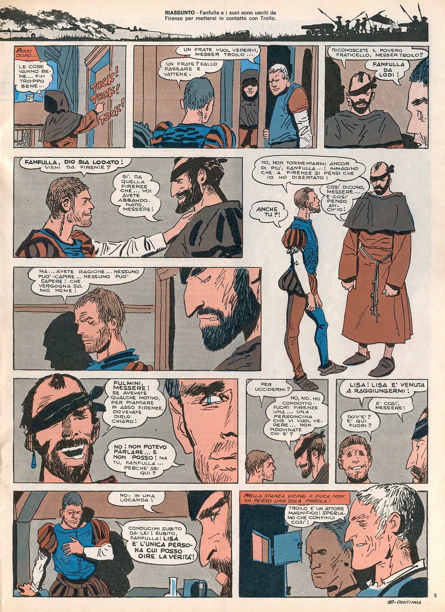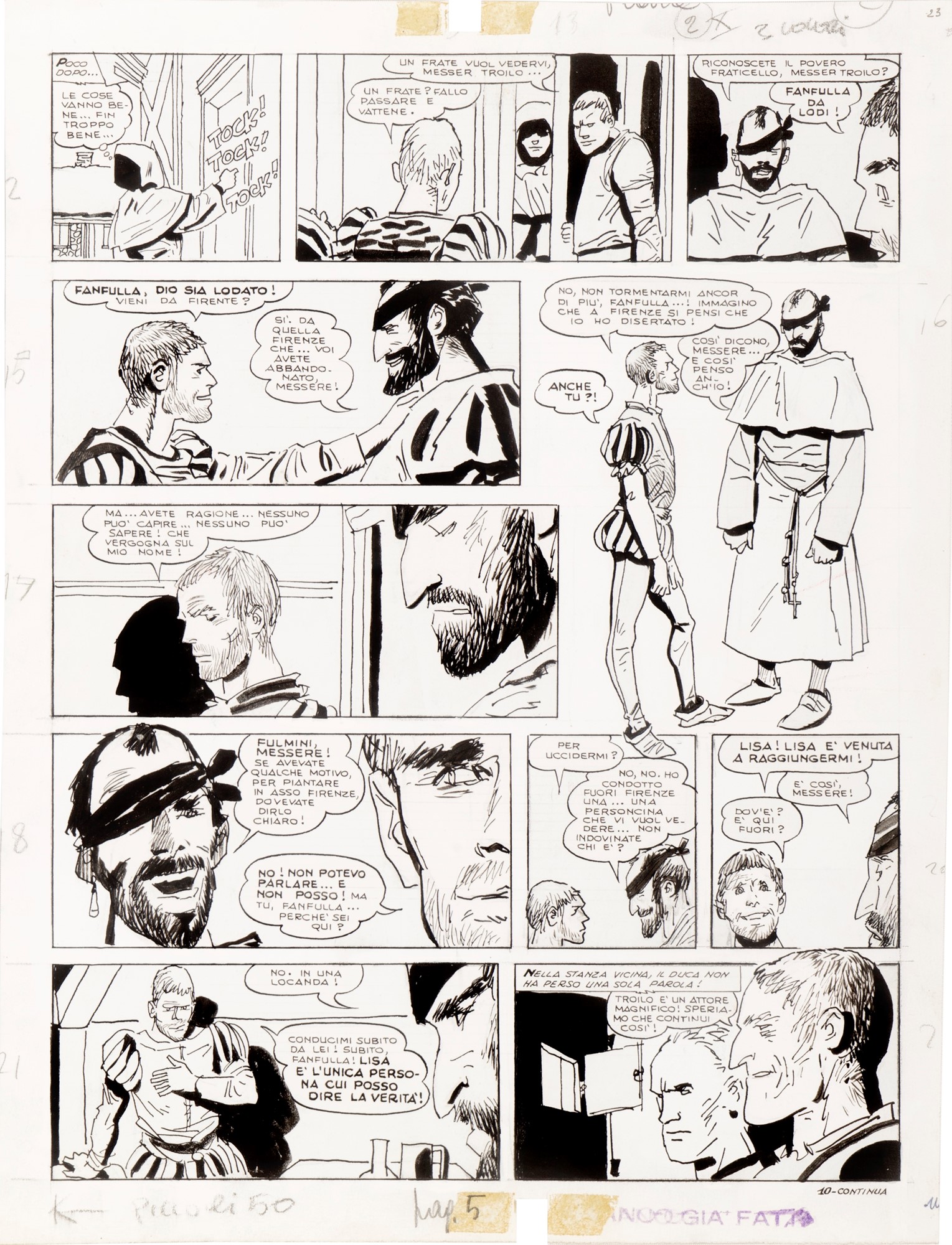 Tavola originale realizzata da Pratt per “Le avventure di Fanfulla”, pag. 23 di questa avventura che narra le gesta del soldato di ventura Fanfulla da Lodi, pubblicata per la prima volta a episodi sulle pagine del Corriere dei Piccoli tra il 1967 e il 1968. Timbro editoriale al retro. Retro acquerellata.