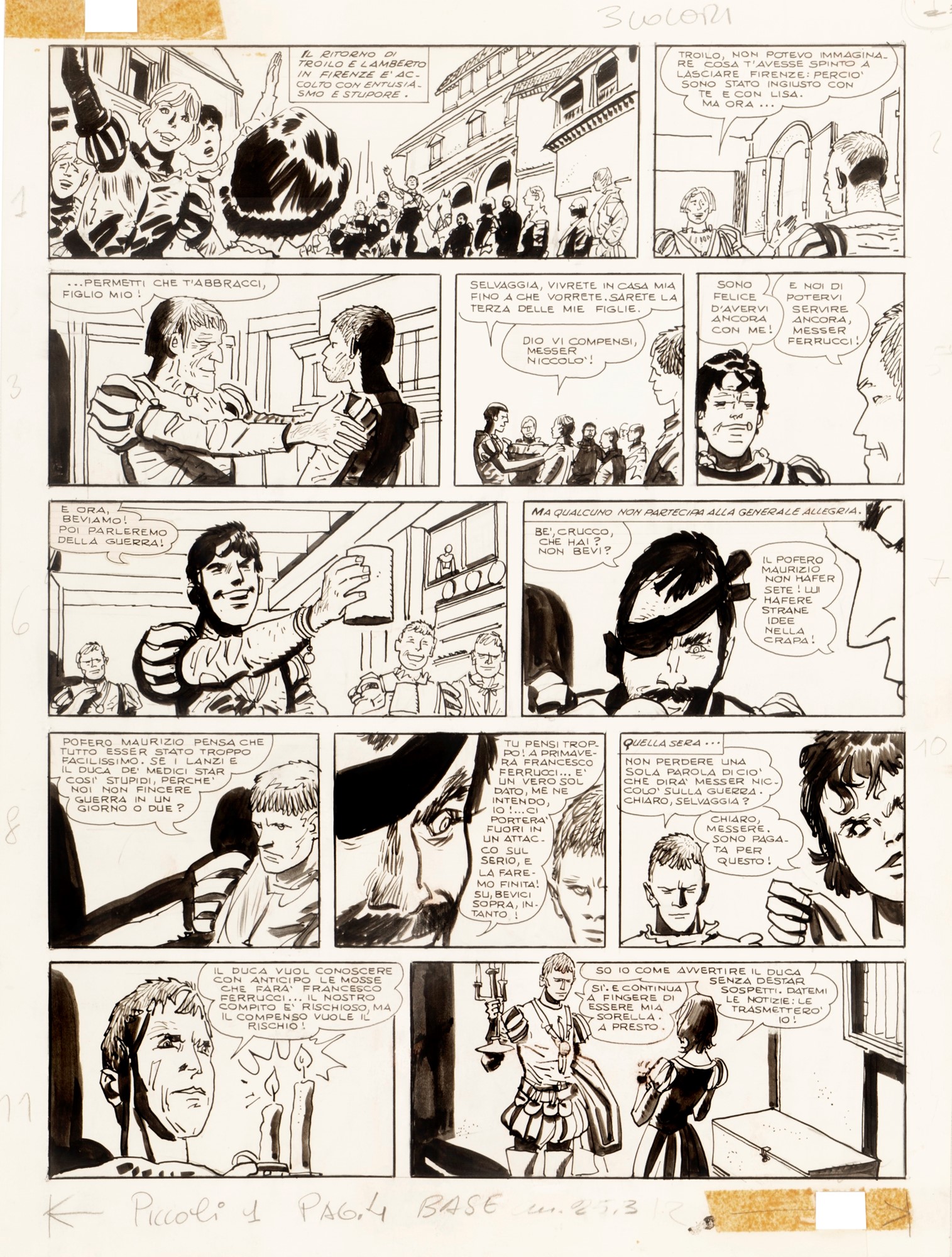 Tavola originale realizzata da Pratt per “Le avventure di Fanfulla”, pag. 30 di questa avventura che narra le gesta del soldato di ventura Fanfulla da Lodi, pubblicata per la prima volta a episodi sulle pagine del Corriere dei Piccoli tra il 1967 e il 1968. Timbro editoriale al retro. Retro acquerellata.