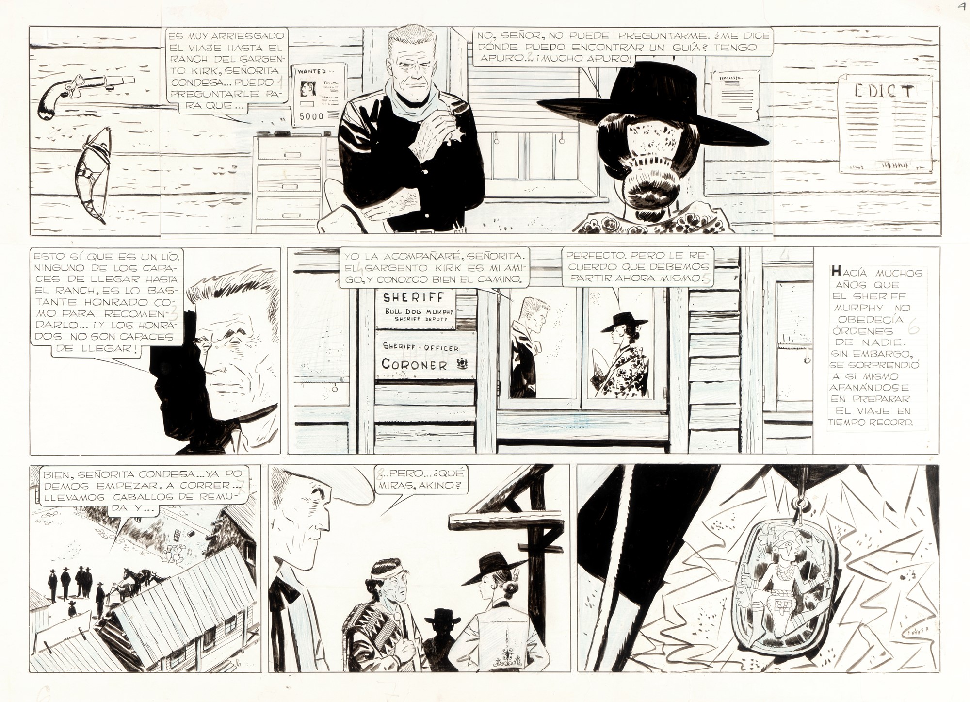 Tavola originale realizzata da Pratt per "Il castello di Titlàn", pag. 4 dell’ultima avventura de Il Sergente Kirk pubblicata per la prima volta in Argentina su Hora Cero Suplemento Semanal n. 64 dall’Editorial Frontera nel Novembre 1958, ristampata in Italia nel volume "Il Sergente Kirk" dalla ANAFI nel 2008. Lievi pieghe.