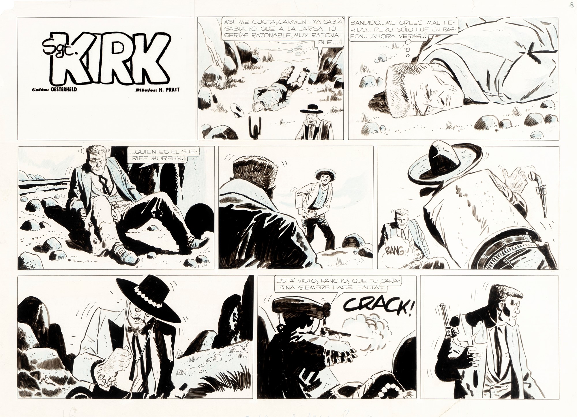 Tavola originale realizzata da Pratt per "Il castello di Titlàn", pag. 8 dell’ultima avventura de Il Sergente Kirk pubblicata per la prima volta in Argentina su Hora Cero Suplemento Semanal n. 66 dall’Editorial Frontera nel Dicembre 1958, ristampata in Italia nel volume "Il Sergente Kirk" dalla ANAFI nel 2008. Mancanza all'angolo superiore sinistro, lievi pieghe e piccoli strappi ai margini. Titolo in fotocopia.