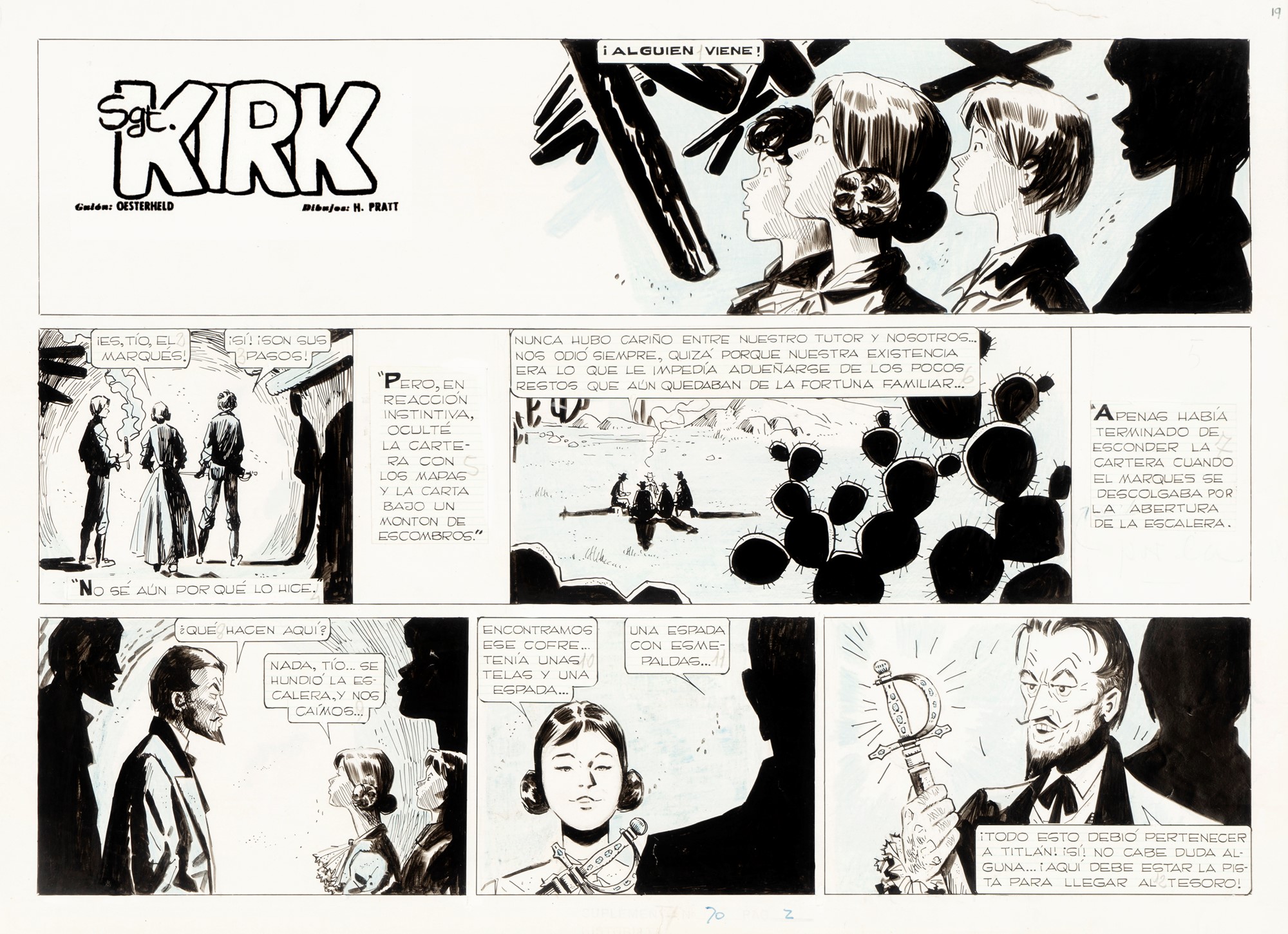 Tavola originale realizzata da Pratt per "Il castello di Titlàn", pag. 19 dell’ultima avventura de Il Sergente Kirk pubblicata per la prima volta in Argentina su Hora Cero Suplemento Semanal n. 70 dall’Editorial Frontera nel Dicembre 1958, ristampata in Italia nel volume "Il Sergente Kirk" dalla ANAFI nel 2008. Lievi pieghe e piccoli strappi ai margini. Titolo in fotocopia