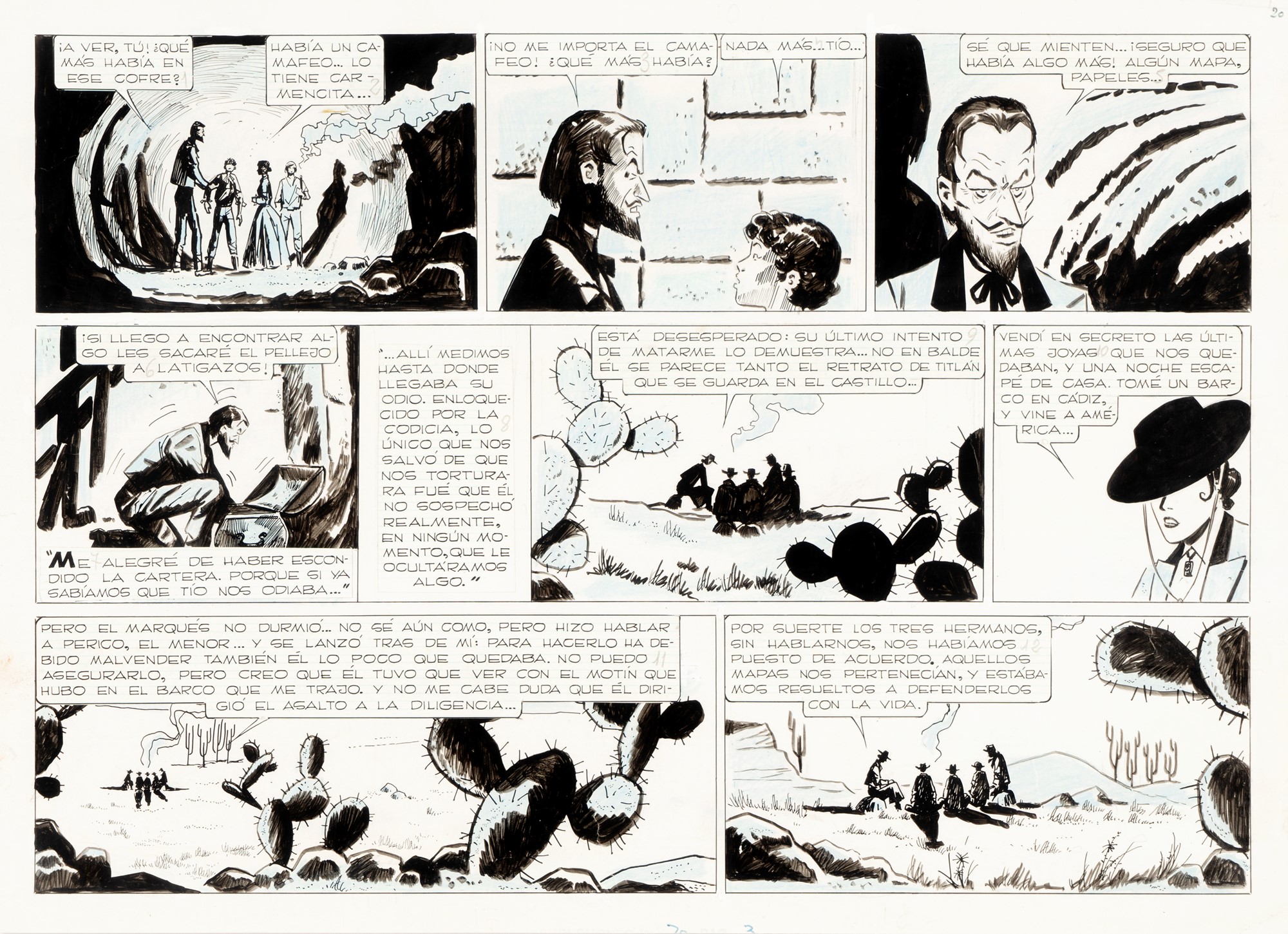 Tavola originale realizzata da Pratt per "Il castello di Titlàn", pag. 20 dell’ultima avventura de Il Sergente Kirk pubblicata per la prima volta in Argentina su Hora Cero Suplemento Semanal n. 70 dall’Editorial Frontera nel Dicembre 1958, ristampata in Italia nel volume "Il Sergente Kirk" dalla ANAFI nel 2008. Lievi pieghe ai margini.