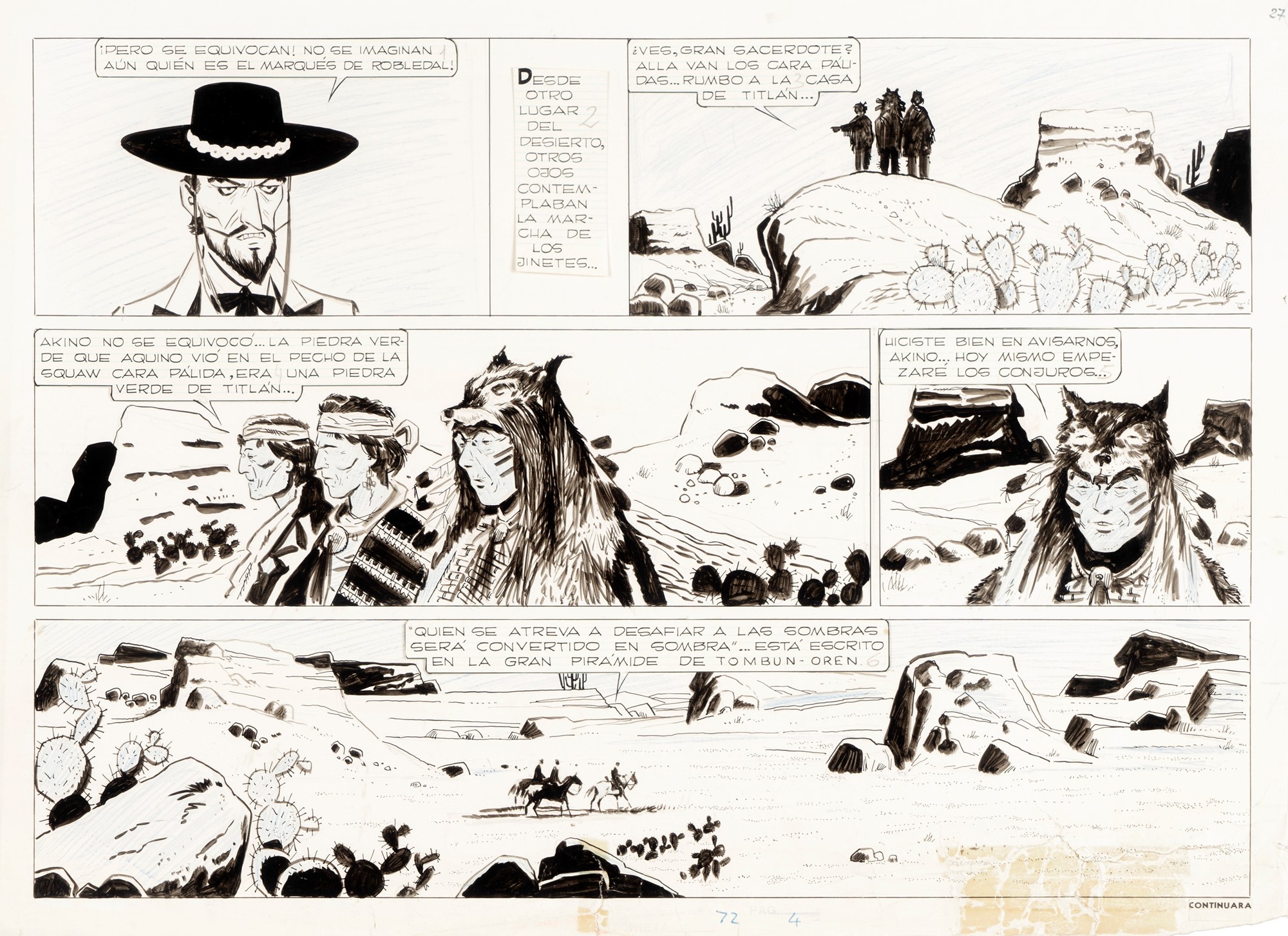 Tavola originale realizzata da Pratt per "Il castello di Titlàn", pag. 27 dell’ultima avventura de Il Sergente Kirk pubblicata per la prima volta in Argentina su Hora Cero Suplemento Semanal n. 72 dall’Editorial Frontera nel Gennaio 1959, ristampata in Italia nel volume "Il Sergente Kirk" dalla ANAFI nel 2008. Lievi pieghe, piccola mancanza all'angolo inferiore destro e strappi estesi al margine inferiore.